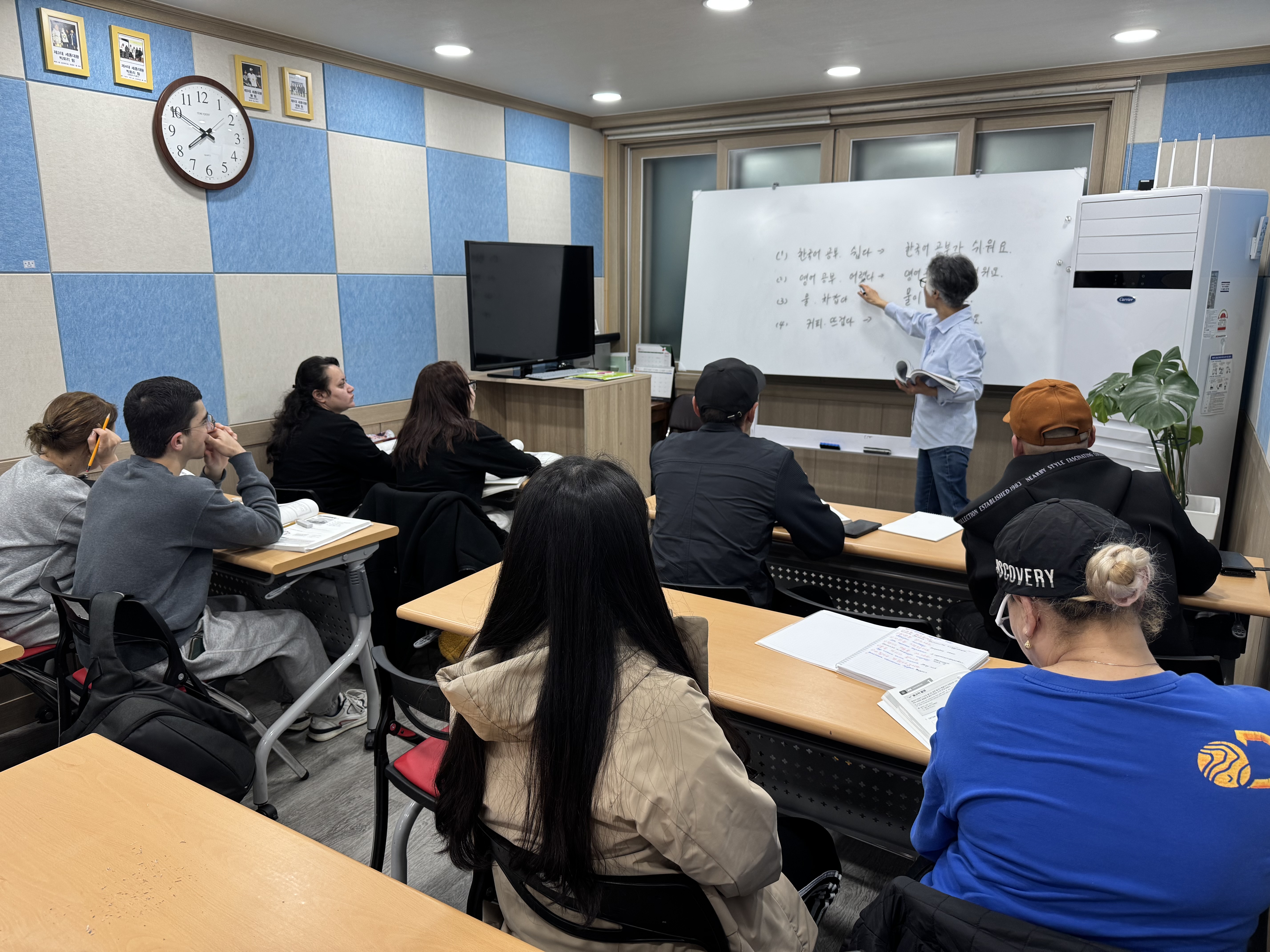 자리배치도 강사가 한국어를 잘하는 사람과 서툰 사람을 함께 앉게 해 서로 도움이 될 수 있도록 하고 있습니다.