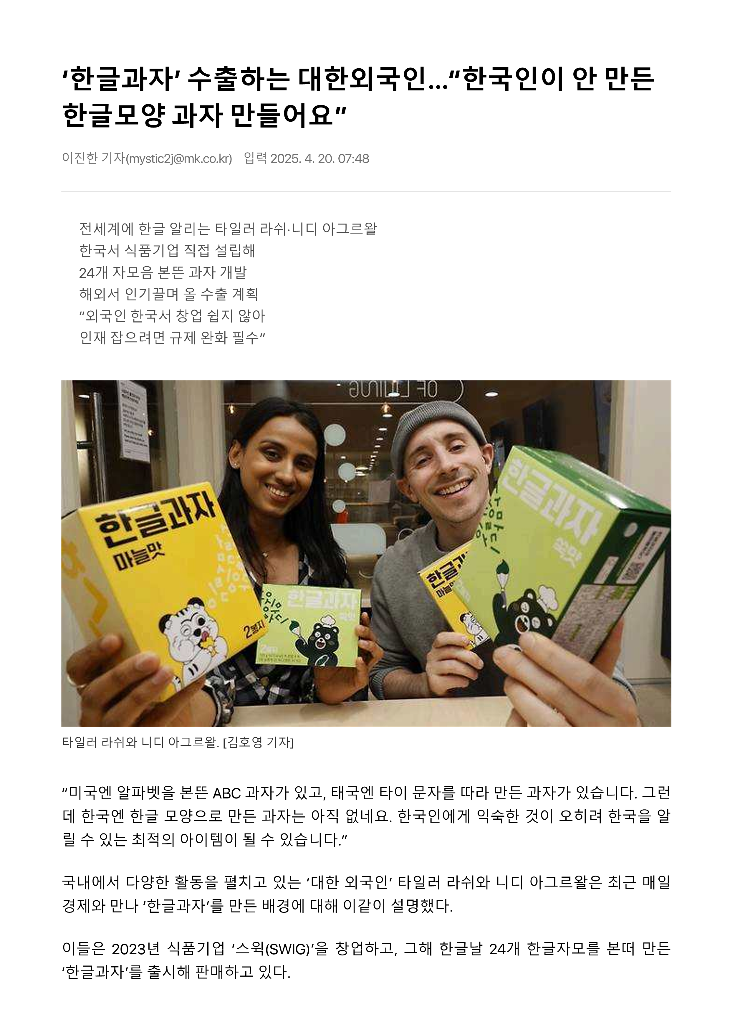 [매일경제] '한글과자' 수출하는 대한외국인..한국인이 안 만든 한글모양 과자 만들어요.
