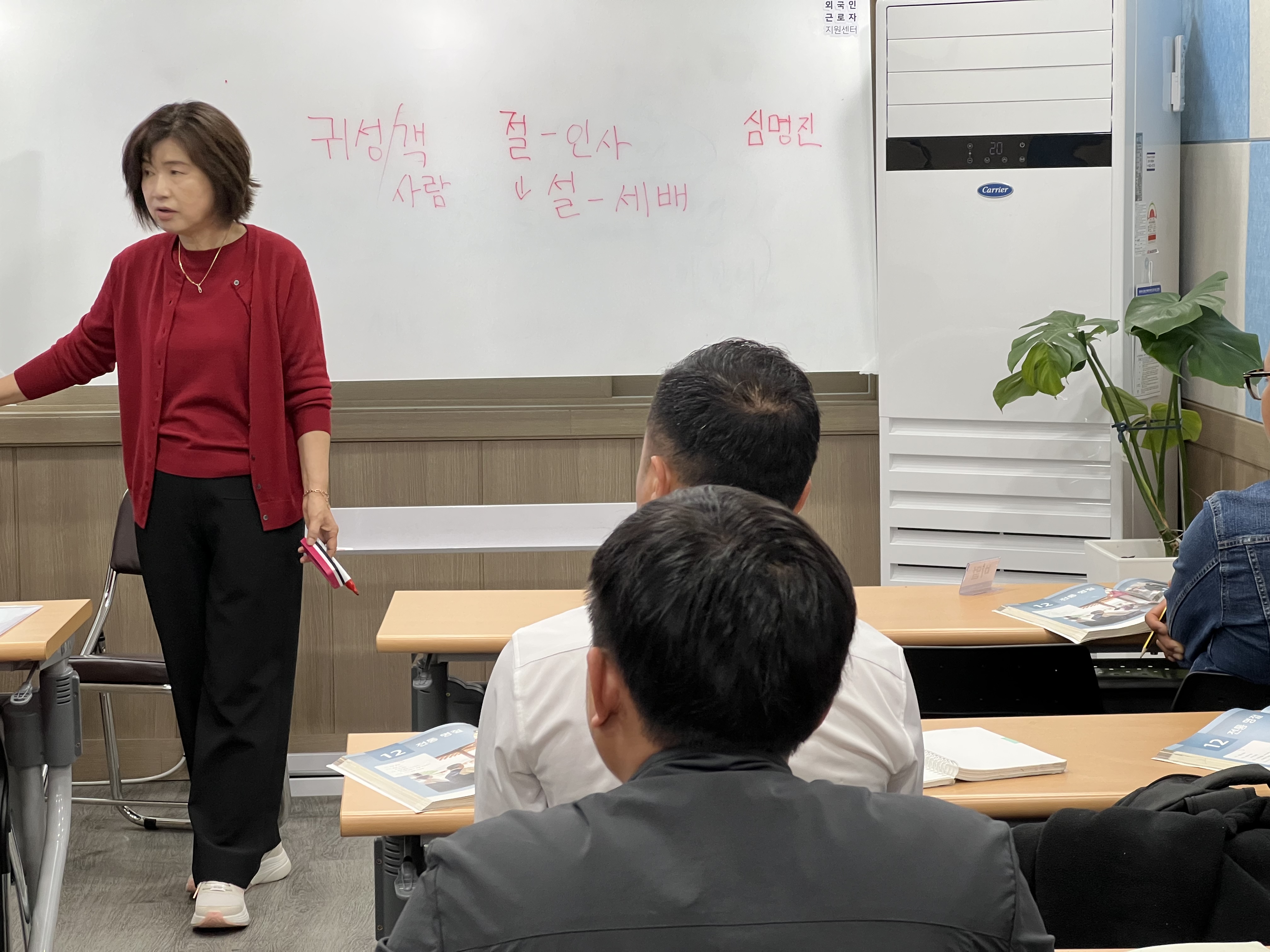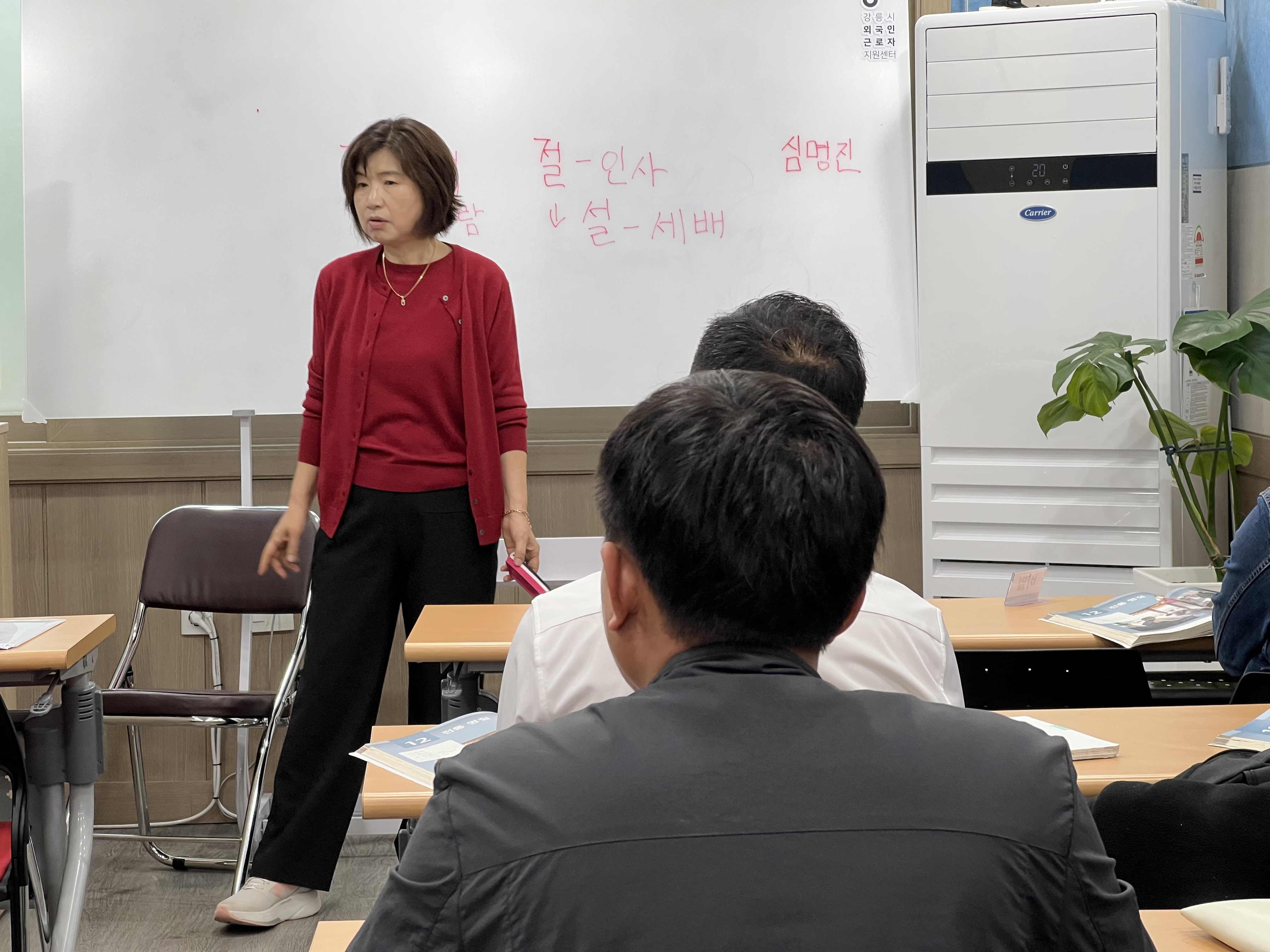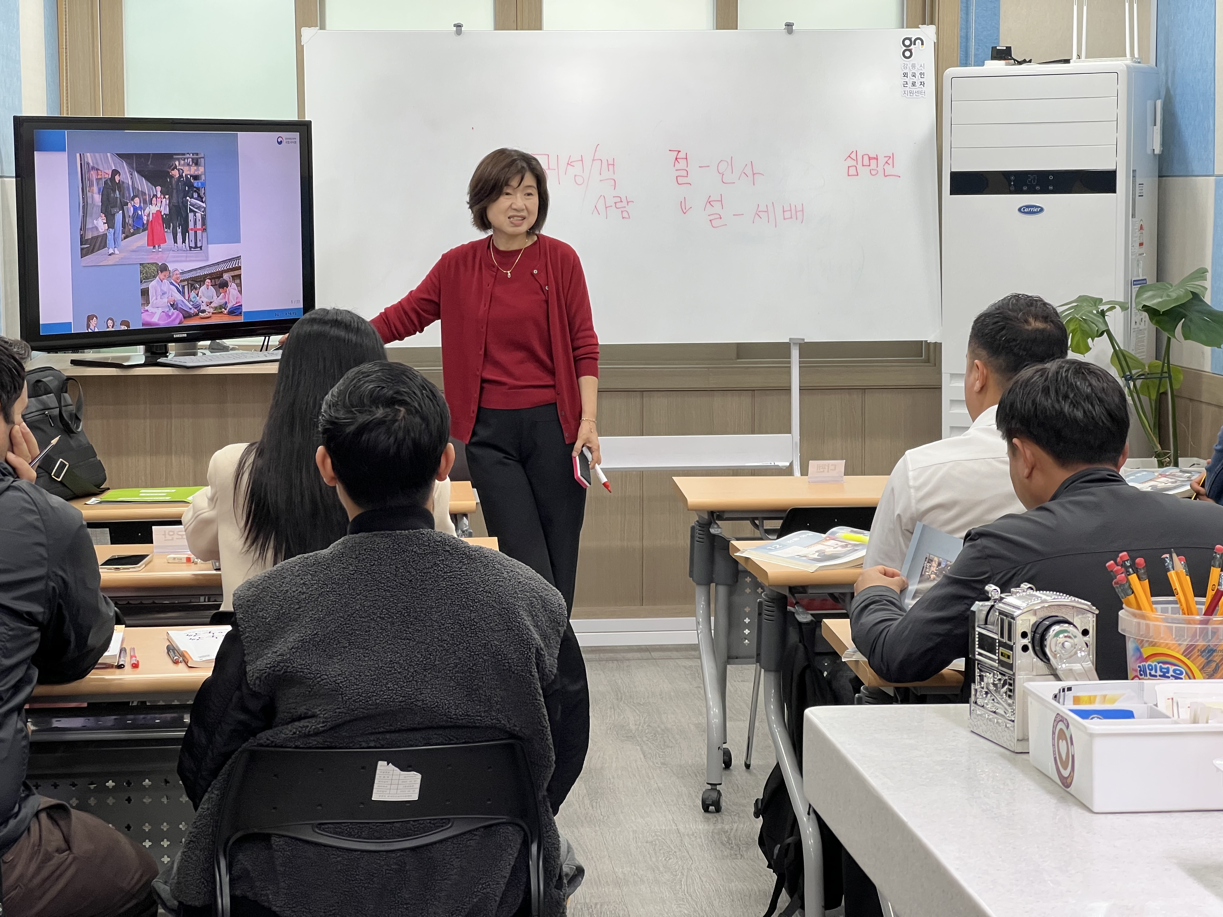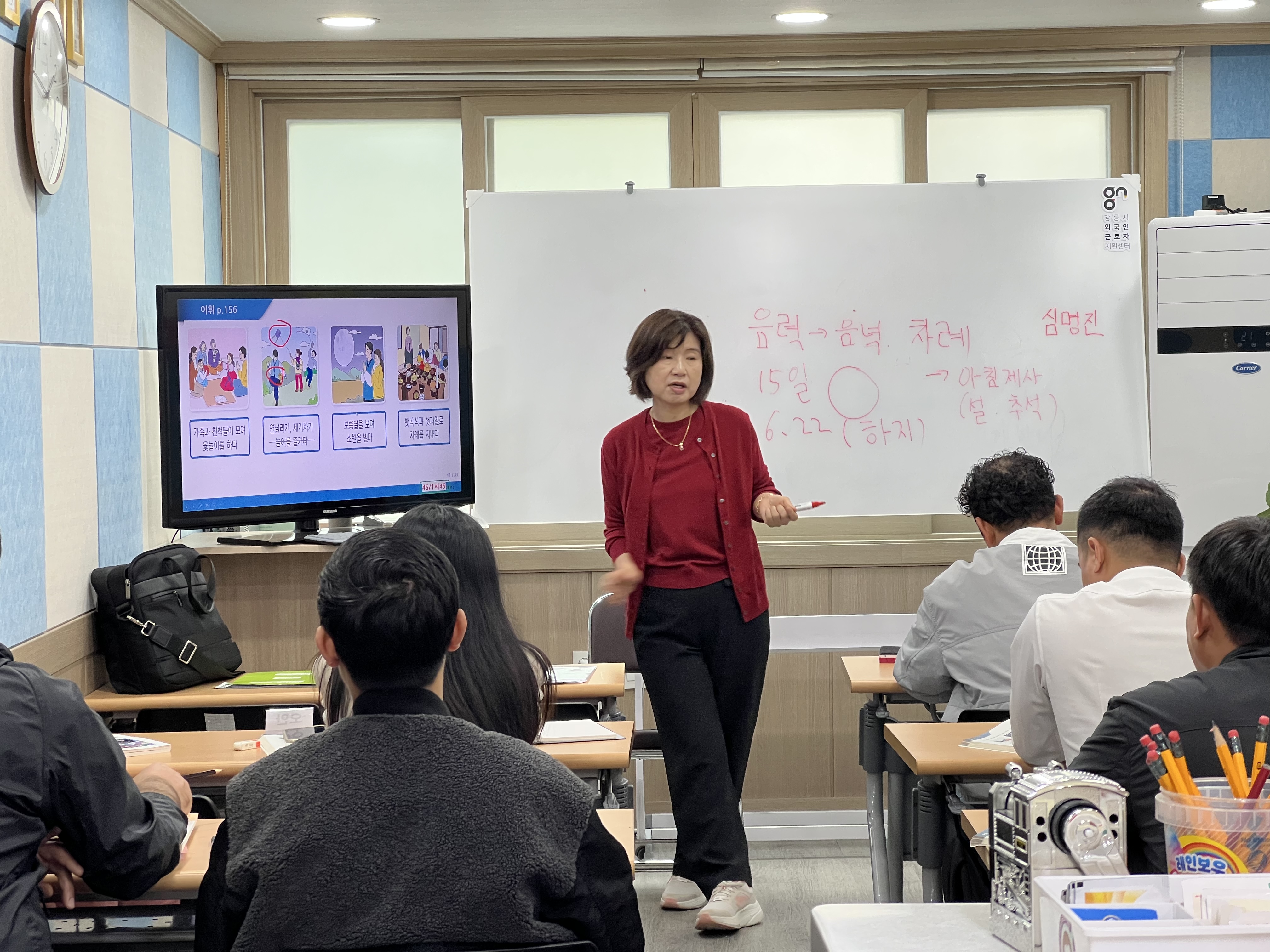 선생님께서 화면과 칠판을 통해 한국의 차례와 절, 인사 문화에 대해 자세히 설명해주셨습니다. 설날과 추석 같은 명절에는 어떤 예를 갖추고, 가족과 어떤 방식으로 시간을 보내는지에 대한 설명에 참여자들의 눈빛이 반짝였어요.