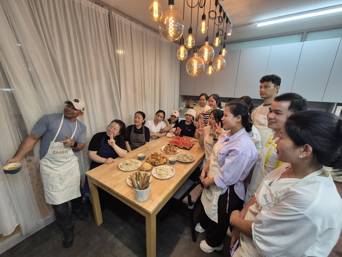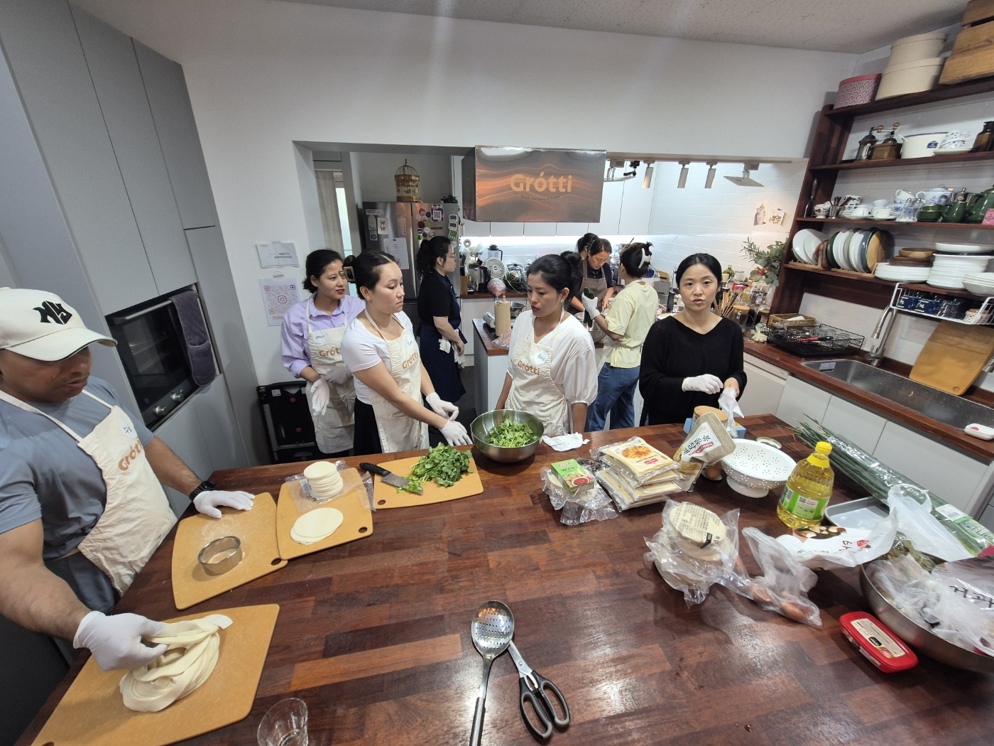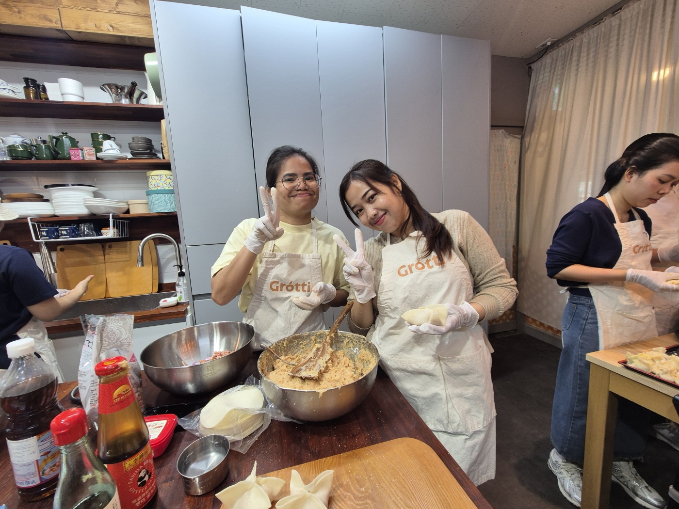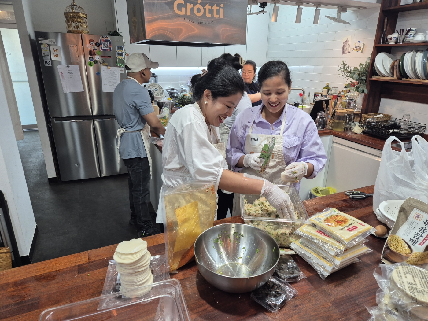 그로티에서 준비한 재료와 각자 가지고 있던 비법 양념을 가지고 와 대결하라는 것도 아닌데 경쟁경쟁, 아주 진지하게 만두를 빚었습니다~각 나라별로 부족한 일손을 거들어가면서 했지만, 200개씩 만드는 것은 쉽지 않았습니다. 게다가 다음 날까지 보관하는 것도 문제였구요.