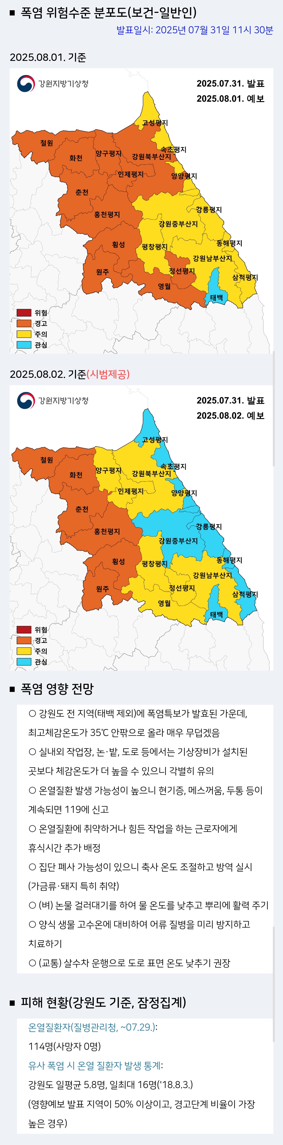 | [강원지방기상청] 강릉 폭염영향예보_경고단계(2025.7.29.기준) (4) | 2025.07.28 |