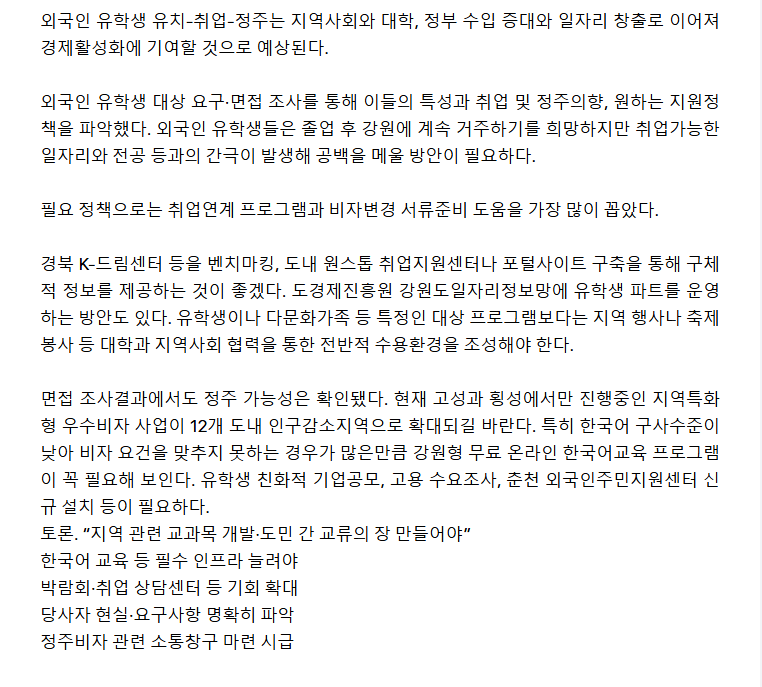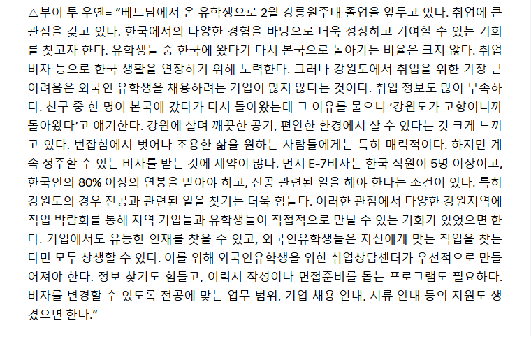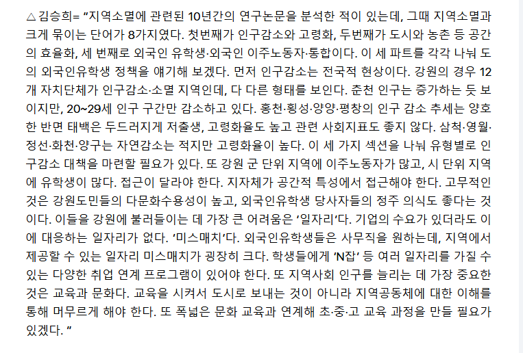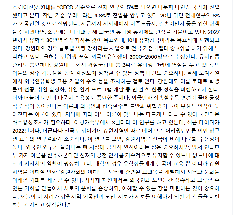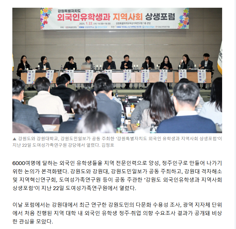 6000여명에 달하는 외국인 유학생들을 지역 전문인력으로 양성, 정주인구로 만들어 나가기 위한 논의가 본격화됐다. 강원도와 강원대, 강원도민일보가 공동 주최하고, 강원대 격차해소 및 지역