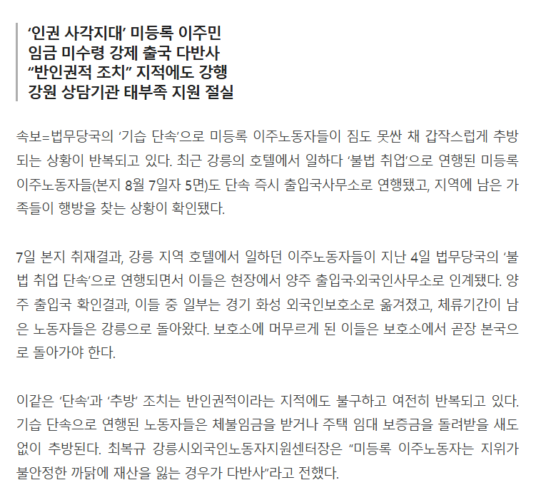 속보=법무당국의 ‘기습 단속’으로 미등록 이주노동자들이 짐도 못싼 채 갑작스럽게 추방되는 상황이 반복되고 있다. 최근 강릉의 호텔에서 일하다 ‘불법 취업’으로 연행된 미등록 이주노