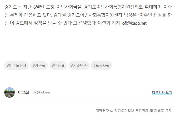 | [강원도민일보] "폭염에도 일하고 다쳐도 외면" 이주여성노동자의 눈물 (1) | 2025.08.08 |