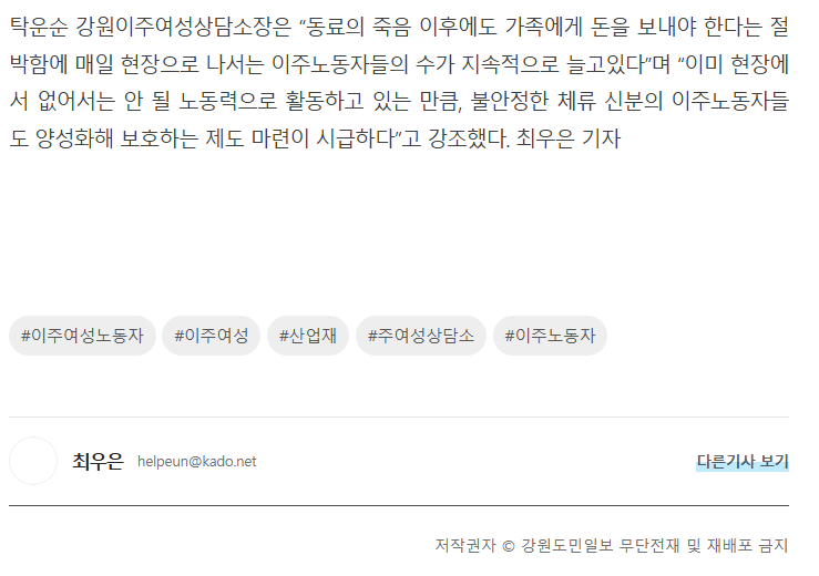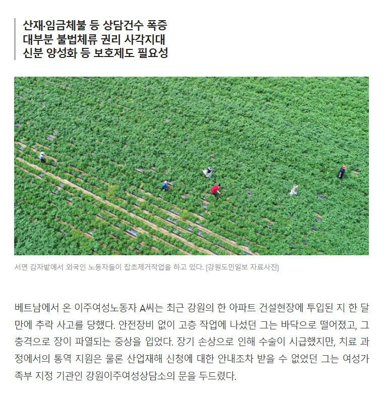 [강원도민일보] "폭염에도 일하고 다쳐도 외면" 이주여성노동자의 눈물