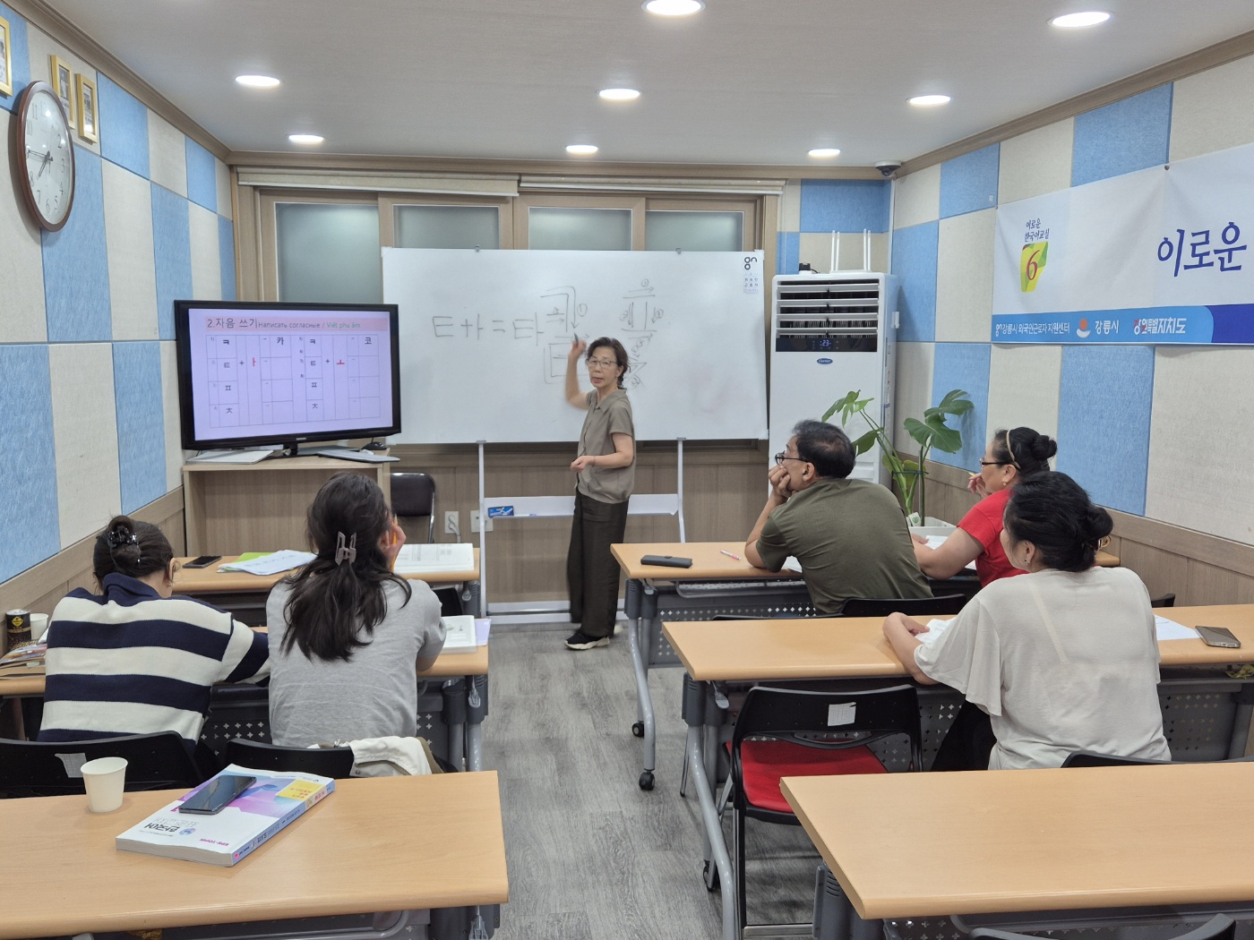 이로운 한국어교실 시즌 6, 수요일 저녁반수업을 하였습니다. 주로 센터 인근에서 러시아어를 사용하는 외국인근로자가 주로 참여하고 있습니다. 문장읽기와 한국문화를 이해하는데 꼭 필요한 내용을 초급 수준으로 진행하고 있습니다. 그러나, 자세히 보면 한국어입문반처럼 한국어의 자음과 모음을 공부하고 있습니다.