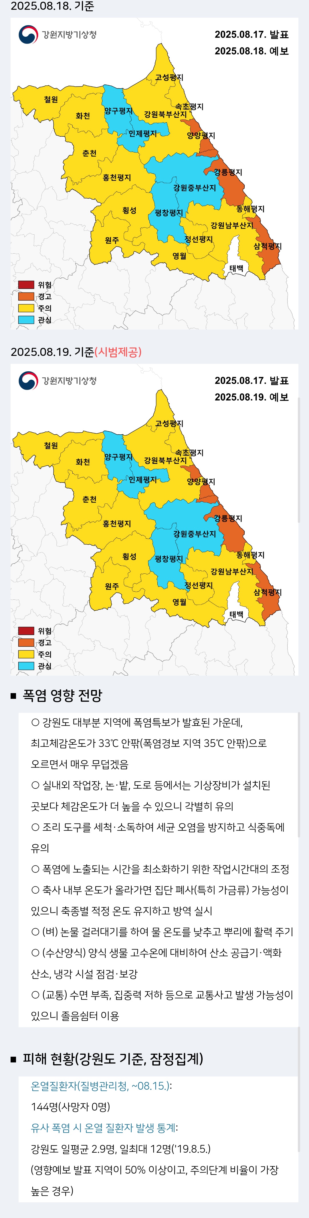 | [강원지방기상청] 강릉 폭염영향예고 경고 단계 (2) | 2025.07.25 |