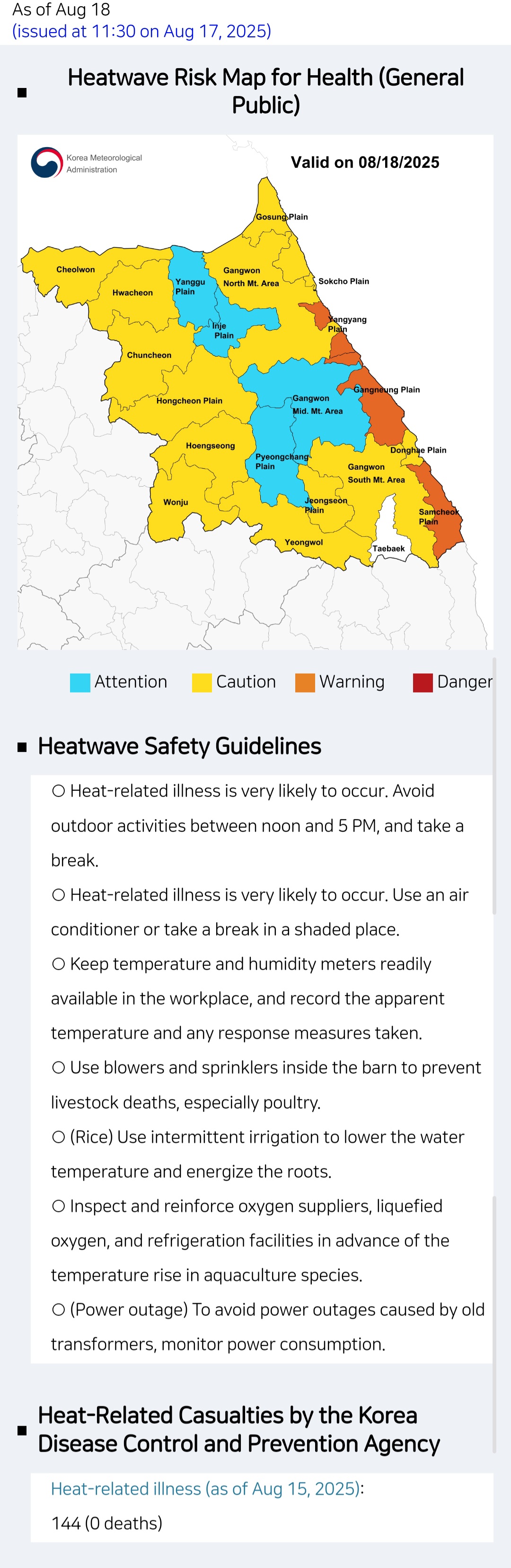 | [강원지방기상청] 강릉지역 폭염영향 예보_주의단계(2025.8.26.) (0) | 2025.08.25 |