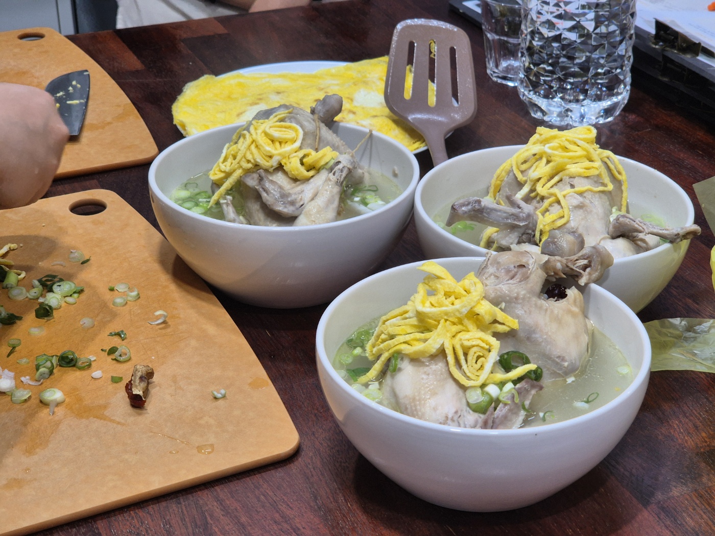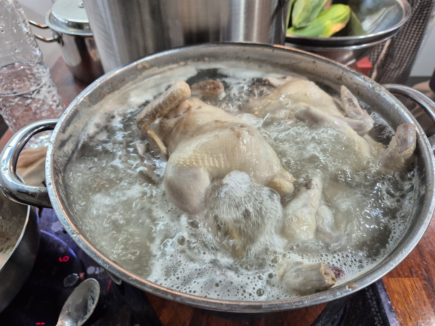 혼자 먹기에는 살짝 버거운 중닭에 찹쌀과 삼, 마늘, 대추를 넣고 닭의 모양을 이쁘게 잡아 줍니다. 그 다음엔 폭 익도록 잘 삶아 줍니다. 닭이 삶이질 동안 맛김치와 땀막홍을 만들기로 했습니다.