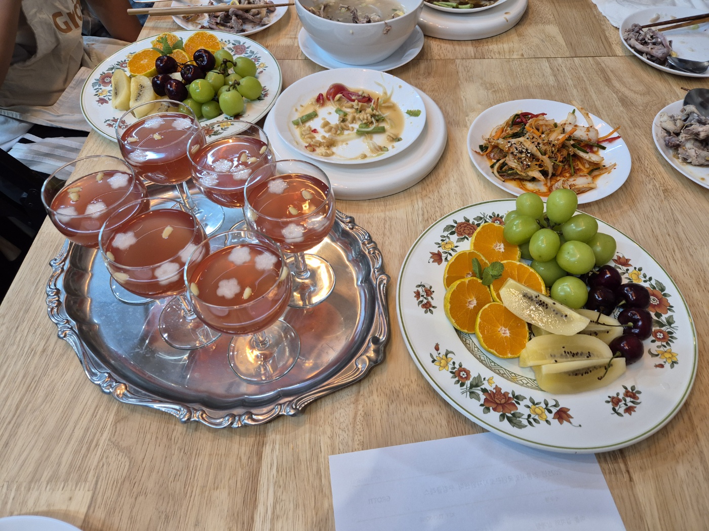 그리고, 후식으로 먹을 오미자차와 과일을 이쁘게 담아 식탁에 옮기고 식사를 했습니다.