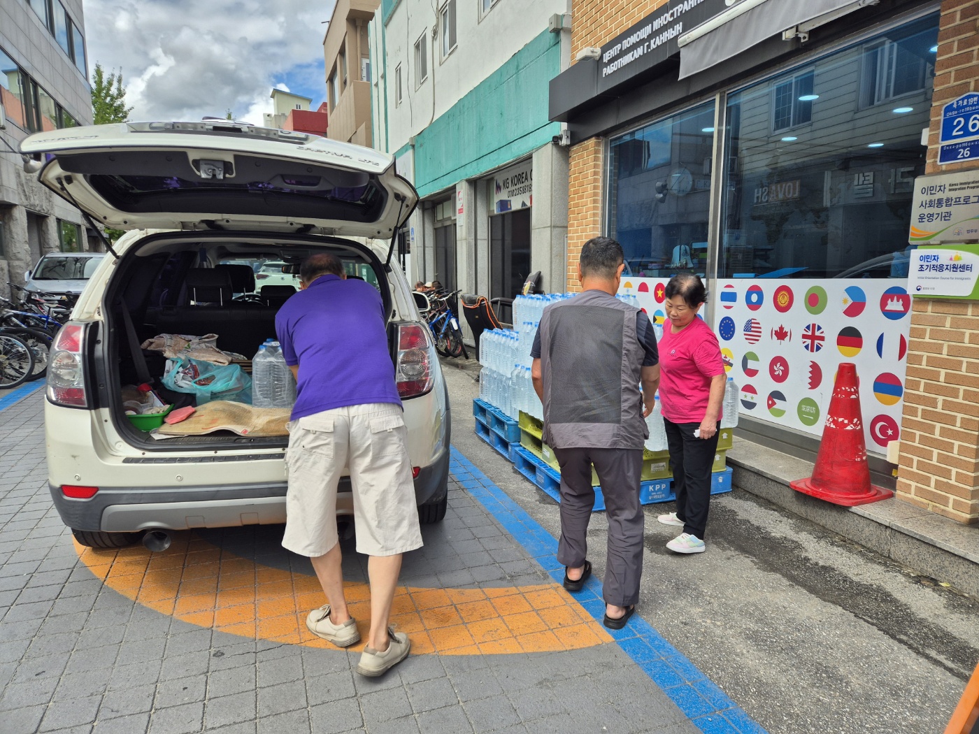 센터 인근 외국인근로자와 소식을 접한 외국인 등 400여명이 2리터 6개가 묶여 있는 팩을 2개씩 가지고 갔습니다.