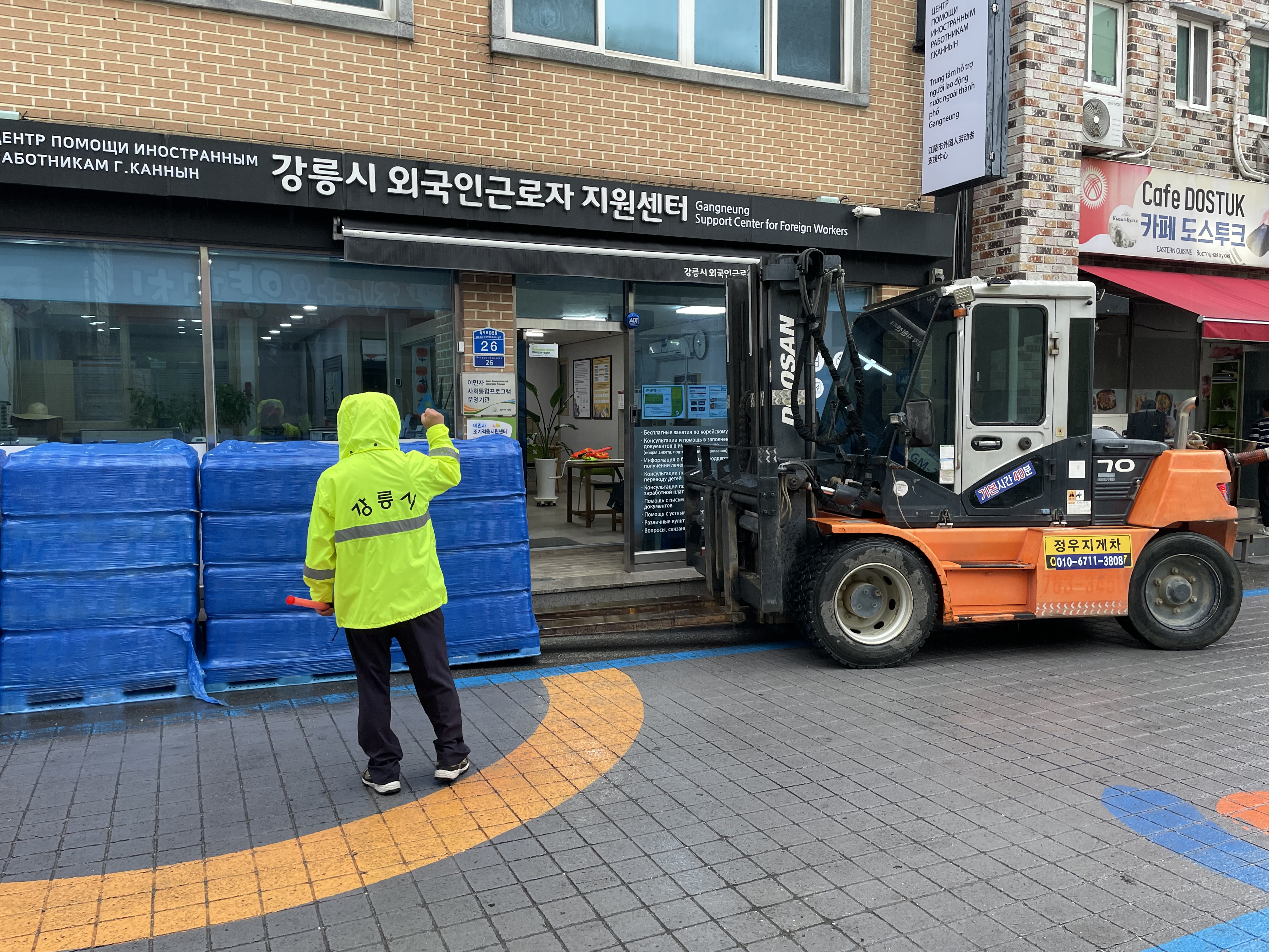 아직 생수는 센터에서 배포하고 있습니다. 여권이나 외국인등록증이 있으면 받아갈 수 있습니다.