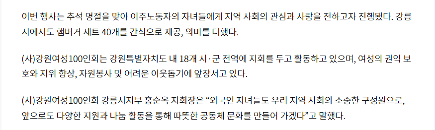 (사)강원여성100인회 강릉시지부, 외국인 자녀에 따뜻한 마음 전달