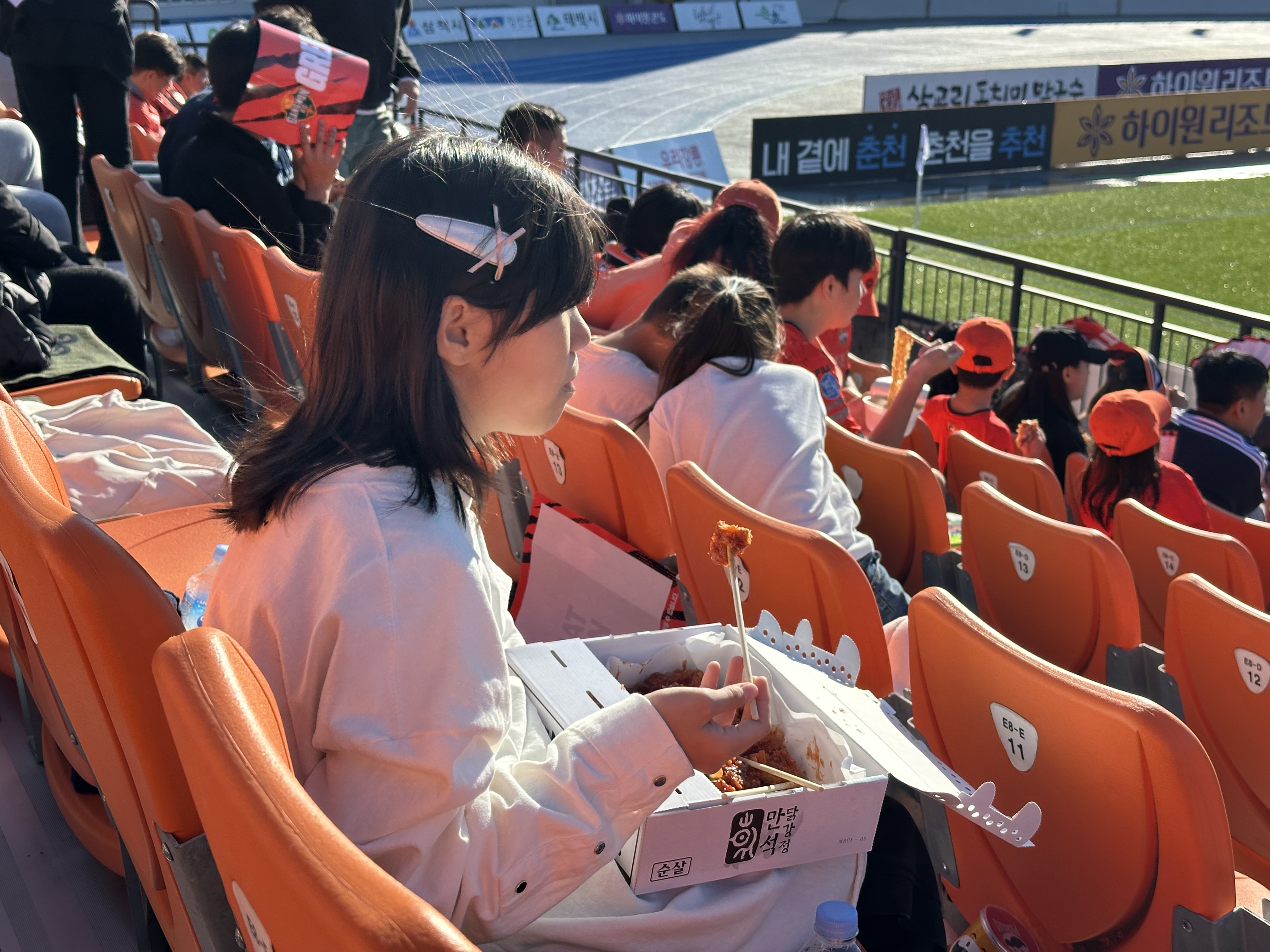 치맥 대신 맛집 닭강정과 각자 준비해 온 음료수를 경기 관람 내내 먹었습니다. 이주배경청소년은 소풍을 온 건지 축구를 보러 온 건지 보따리에서 먹을 것이 계속 나오더라구요.
