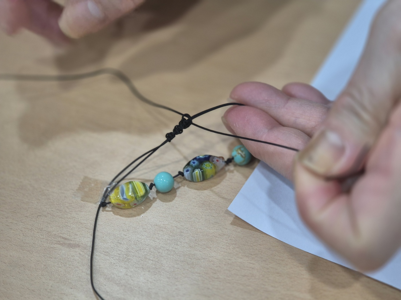 목걸이와 팔찌 중 한개를 선택하고, 비즈를 선택하고, 실에 꿰어 배열하고, 손목이나 목에 적당한 길이로 착용할 수 있도록 매듭을 마무리 하는 순으로 진행되었습니다.