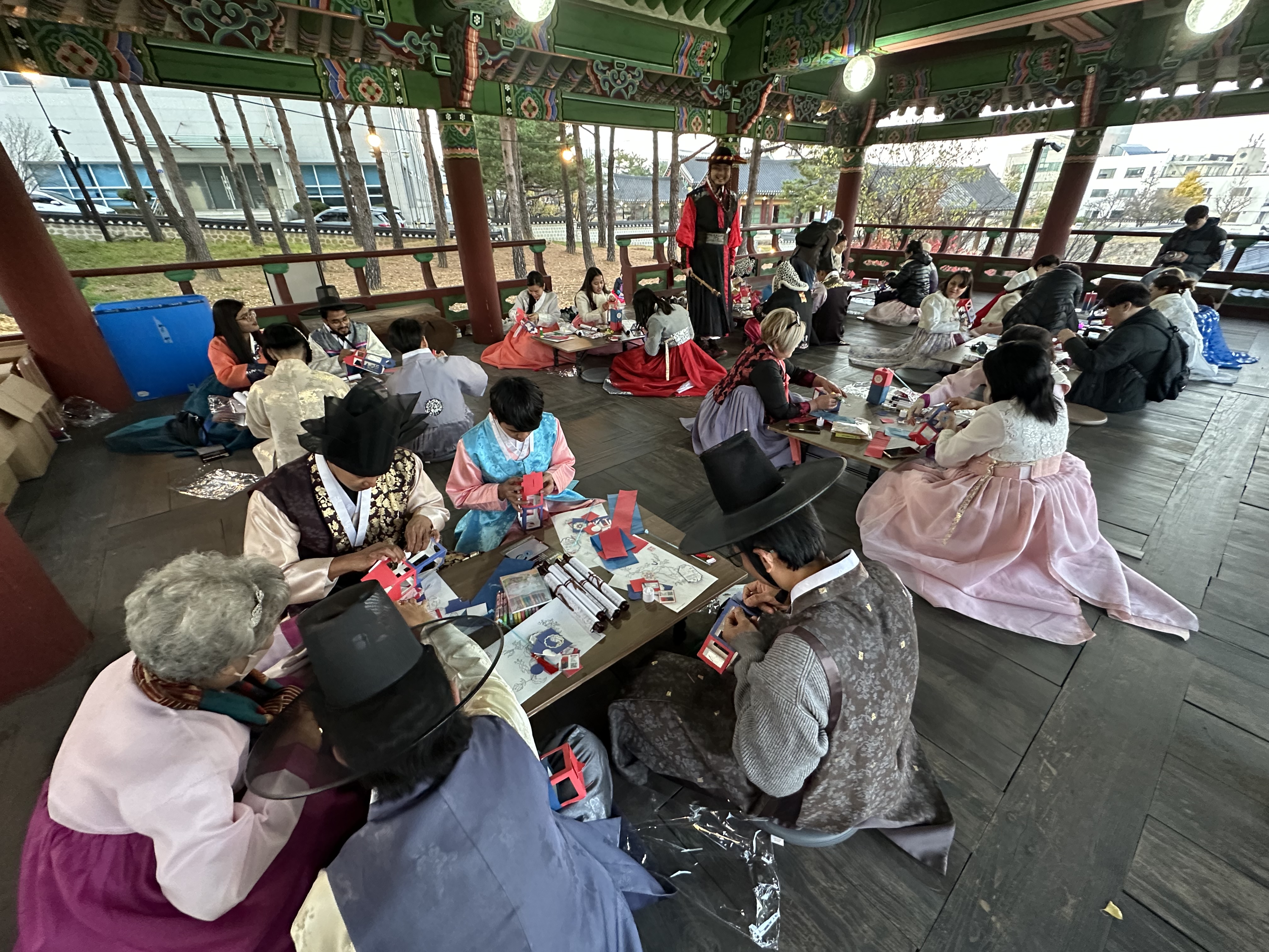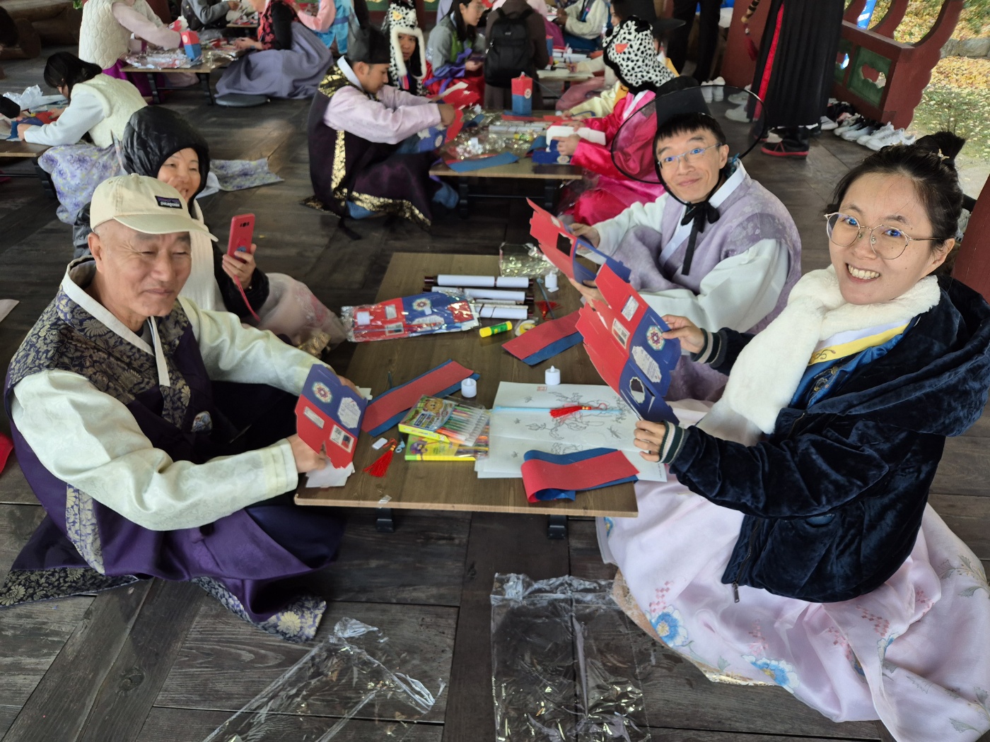 낮에는 포근했던 날씨가 갑자기 추워져서 초롱을 만드는 것이 힘들었습니다. 손이 떨린다고 고생이라면서도 끝까지 모두 만들었습니다. 단체로 사진을 못찍은 것이 아쉬웠습니다. 초롱 한개와 초충도 족자 한개씩 받아서 다음 장소로 이동했습니다.