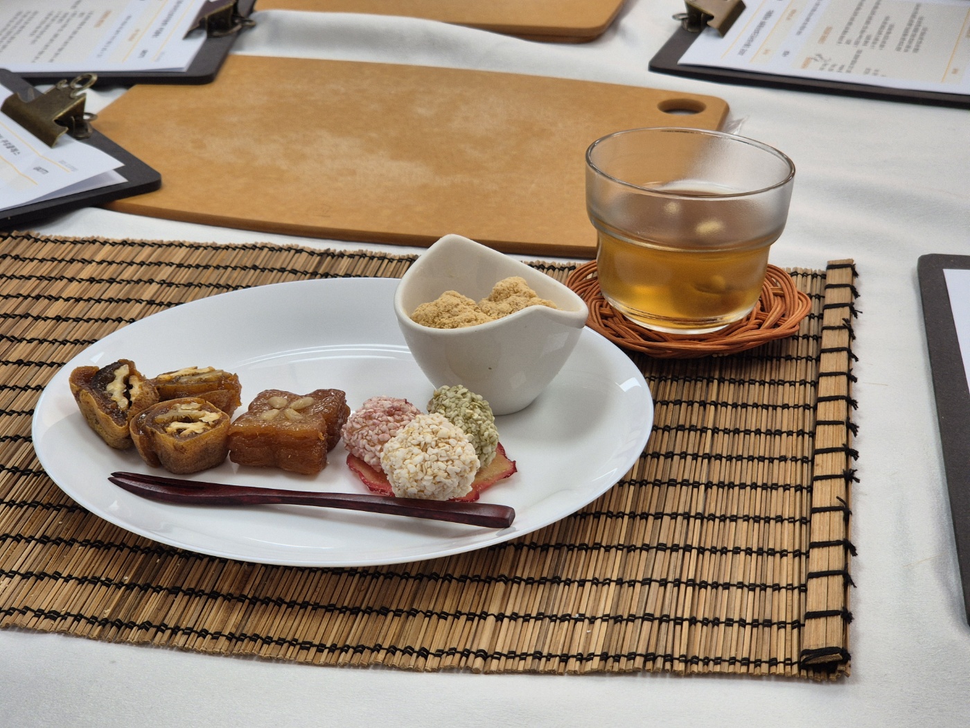 수수한 접시에 직접 만든 인절미와 곶감말이, 강릉한과, 수정과로 멋진 K디저트를 만들었습니다. 사진찍고, 맛보고~~이야기도 나누면서 좋은 시간을 보낼 때 쯤....