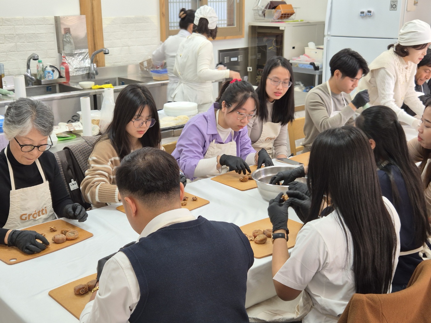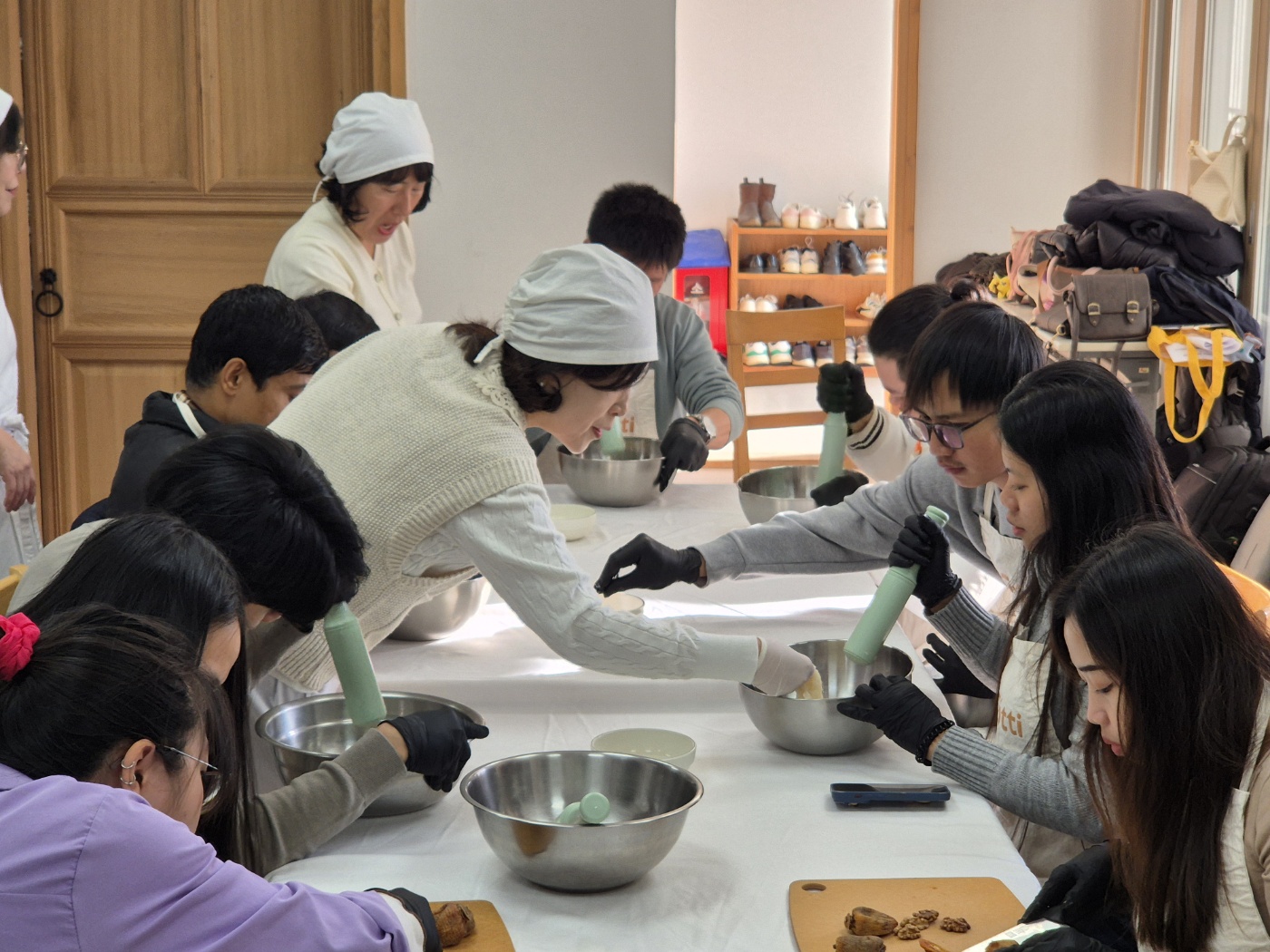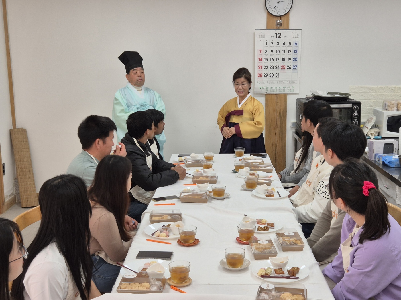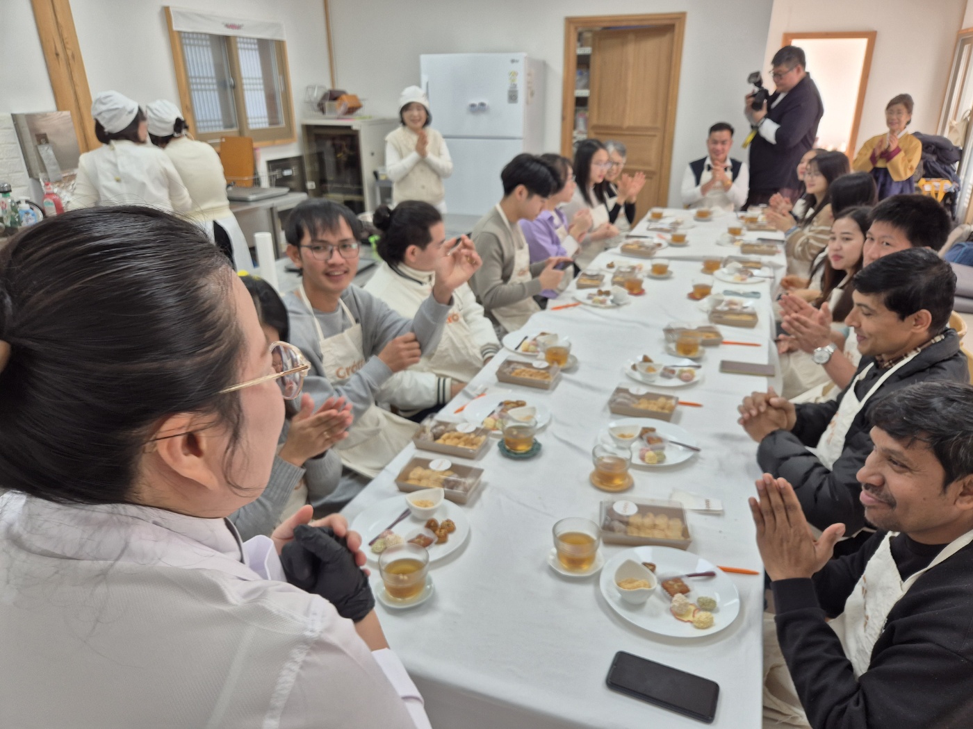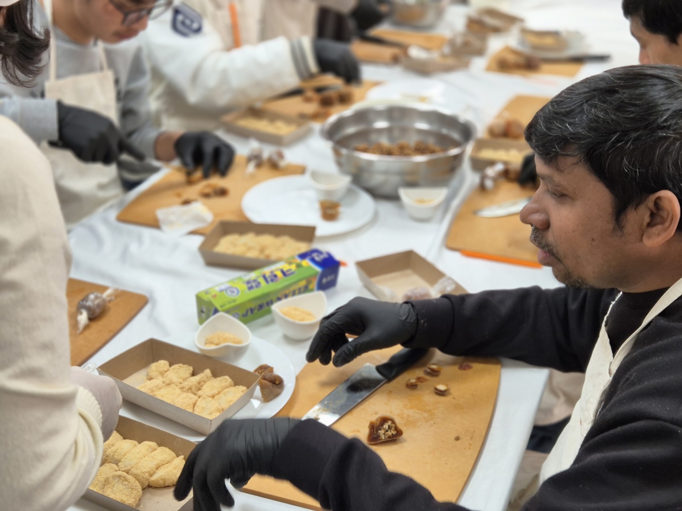 한국에 살면서 한복을 한번 쯤 입어봤을 것이고, 한국전통 과자도 먹어봤겠지만, 입고 사진만 찍어봤을 한복의 바른 착용법과 예절을 배워 보진 못했을 것입니다. 게다가 한국전통과자를 직접 만들어 먹어 봤을 리는 없잖아요~했지만, 이미 체험을 해본 외국인근로자도 있었습니다. 그 외국인근로자를 제외하고 모두 처음이니, 열심히 해보자고 화이팅하고 시작했습니다.