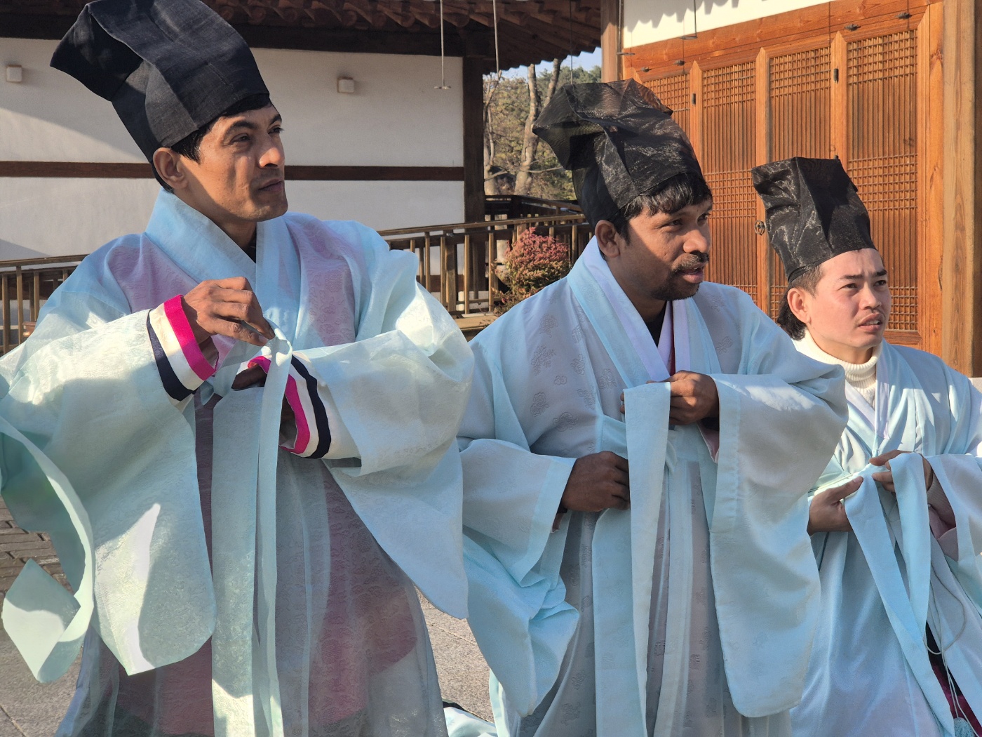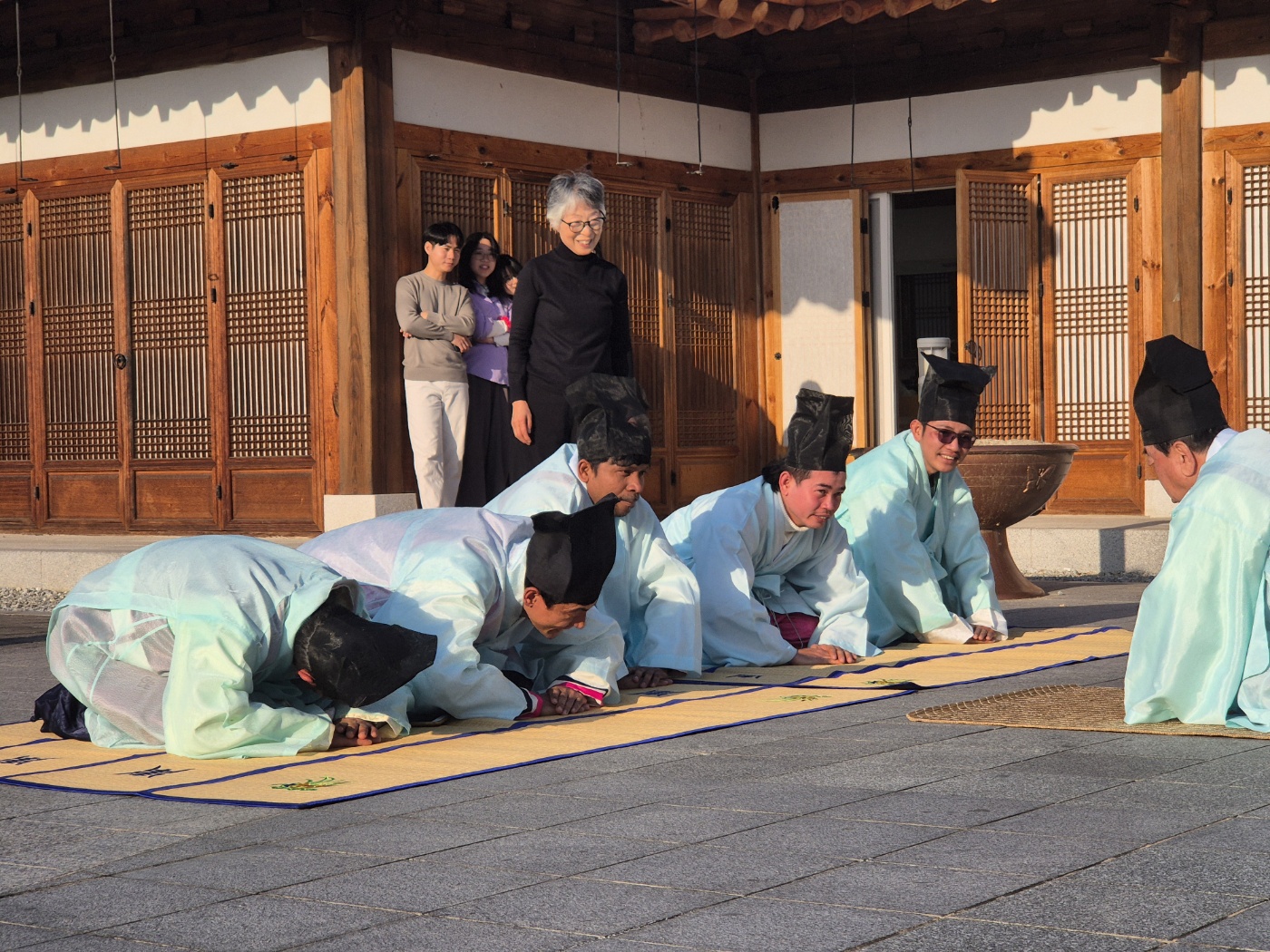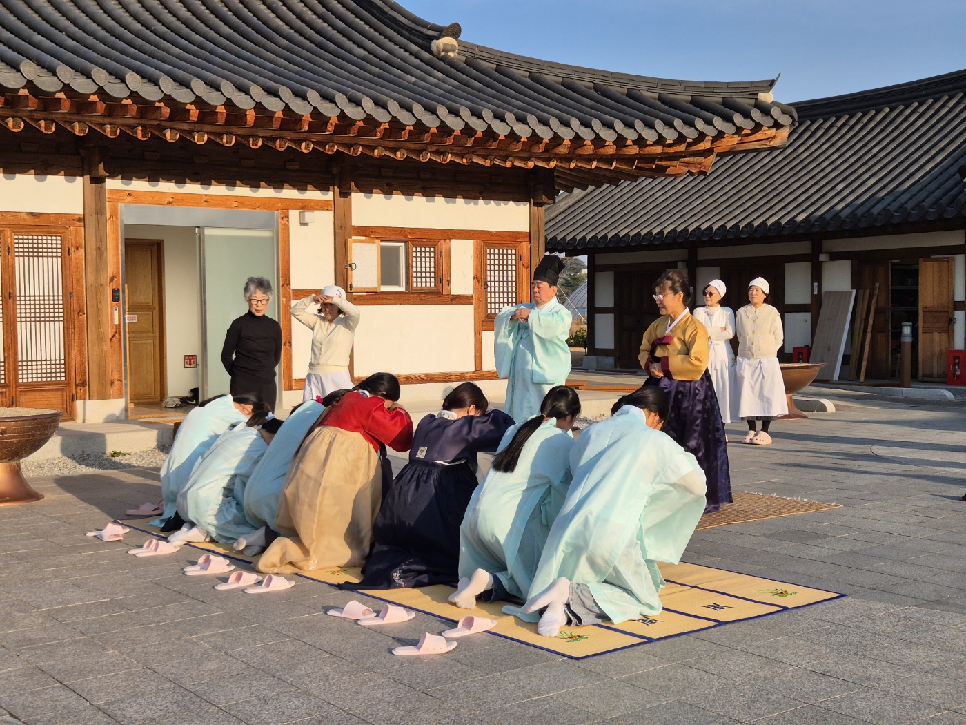 한복입고 절하는 것을 배웠는데요. 쉽지 않았습니다. 입식문화에 익숙하다 보니, 무릎을 꿇는 것도 어렵고, 다리를 꼬는 것도, 무릎을 세우는 것도, 손을 어디에 둬야 하는 지도 모르겠고~말도 어렵고 아주 어색했지만 눈치껏 잘 따라 했습니다.