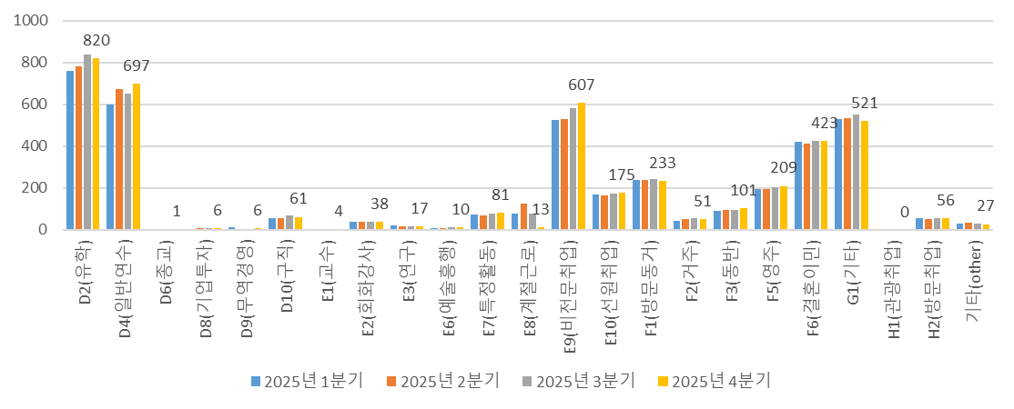 체류자격 대분류 별로 살펴보면, D2체류자격이 820명(19.7%)으로 가장 많으며, D4체류자격이 697명(16.8%), G1체류자격이 521명(12.5%) 순으로 나타났습니다. 유학관련 비자인 D자격이 전체 등록외국인의 36.5%를 차지하고 있습니다. 출입국관리법에 따라 취업할 수 있는 체류자격인 C4, E1~E7, E8, E10, H1, H2, F2, F4, F5, F6를 가지고 있는 외국인은 1,684명으로 40.5%입니다. 아래 그래프의 수치는 2025년 4분기 값입니다.