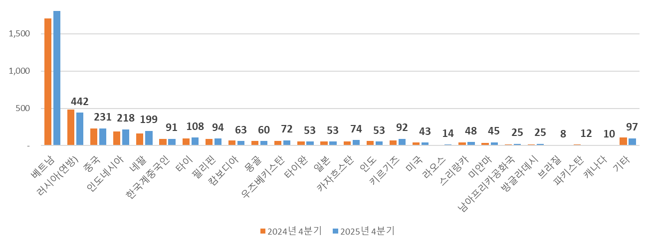 국적별 등록외국인 현황을 보면, 베트남이 1,927명(46.4%)으로 가장 많으며, 러시아(연방) 442명(10.6%), 중국 231명(5.6%)순으로 많습니다. 방글라데시(11.5%), 남아프리카공화국(6.6%), 베트남(2.6%)국적의 외국인의 연평균 증가율은 증하고 있는 반면, 러시아(연방)(-1.5%), 인도(-2.8%), 파키스탄(-1.3%)는 감소하고 있는 것으로 나타났습니다. 아래 그래프의 수치는 2025년 4분기 값입니다.