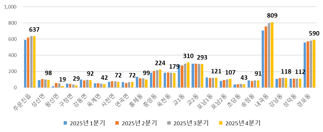 강릉시 동별등록현황을 보면, 내곡동이 809명(19.5%)으로 가장 많으며, 주문진 637명(15.3%), 경포동 590명(14.2%) 순으로 많습니다. 아래 그래프의 수치는 2025년 4분기 값이며, 지난 1년간 각 동별등록외국인현황을 나타내고 있습니다.