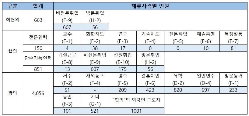 외국인근로자라는 개념을 최협의, 협의, 광의의 개념으로 구분해 보면, 가장 좁은 의미의 외국인근로자를 외국인근로자의 고용 등에 관한 법률에서 정하는 고용허가제 외국인근로자로 할 경우 663명이며, 협의로는 취업목적으로 체류자격을 가진 외국인근로자로 할 경우 전문인력 150명, 단순기능인력 851명으로 총 1,001명 이라 할수 있습니다. 가장 넓은 의미로 연령에 관계없이 외국인근로자를 정의할 경우 4,056명으로 볼수 있을 것입니다.(이 내용은 강릉시 외국인근로자 실태조사 연구용역(2021년)의 내용을 반영해 작성하였습니다)