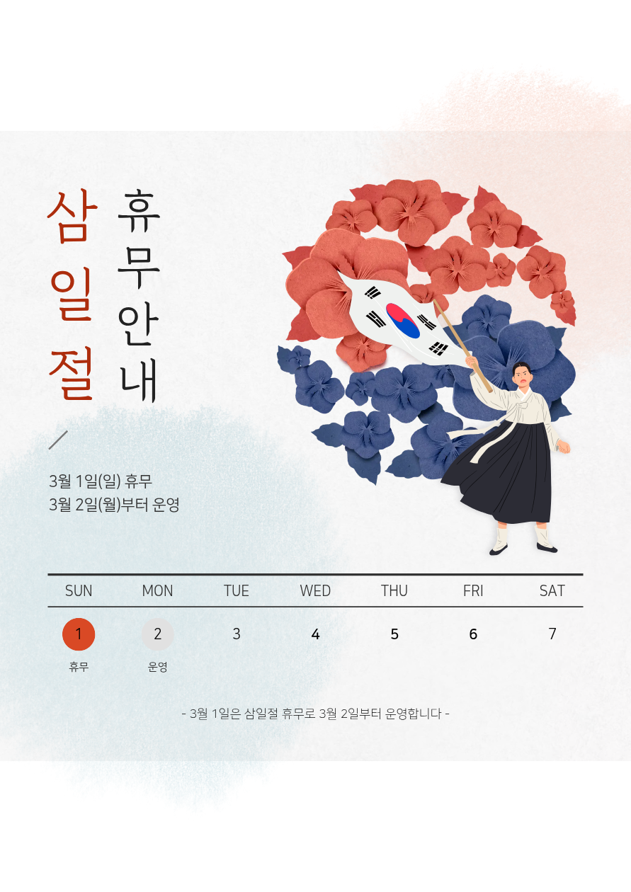 3월 1일은 삼일절 휴무로 인하여 센터 운영을 하지 않고,