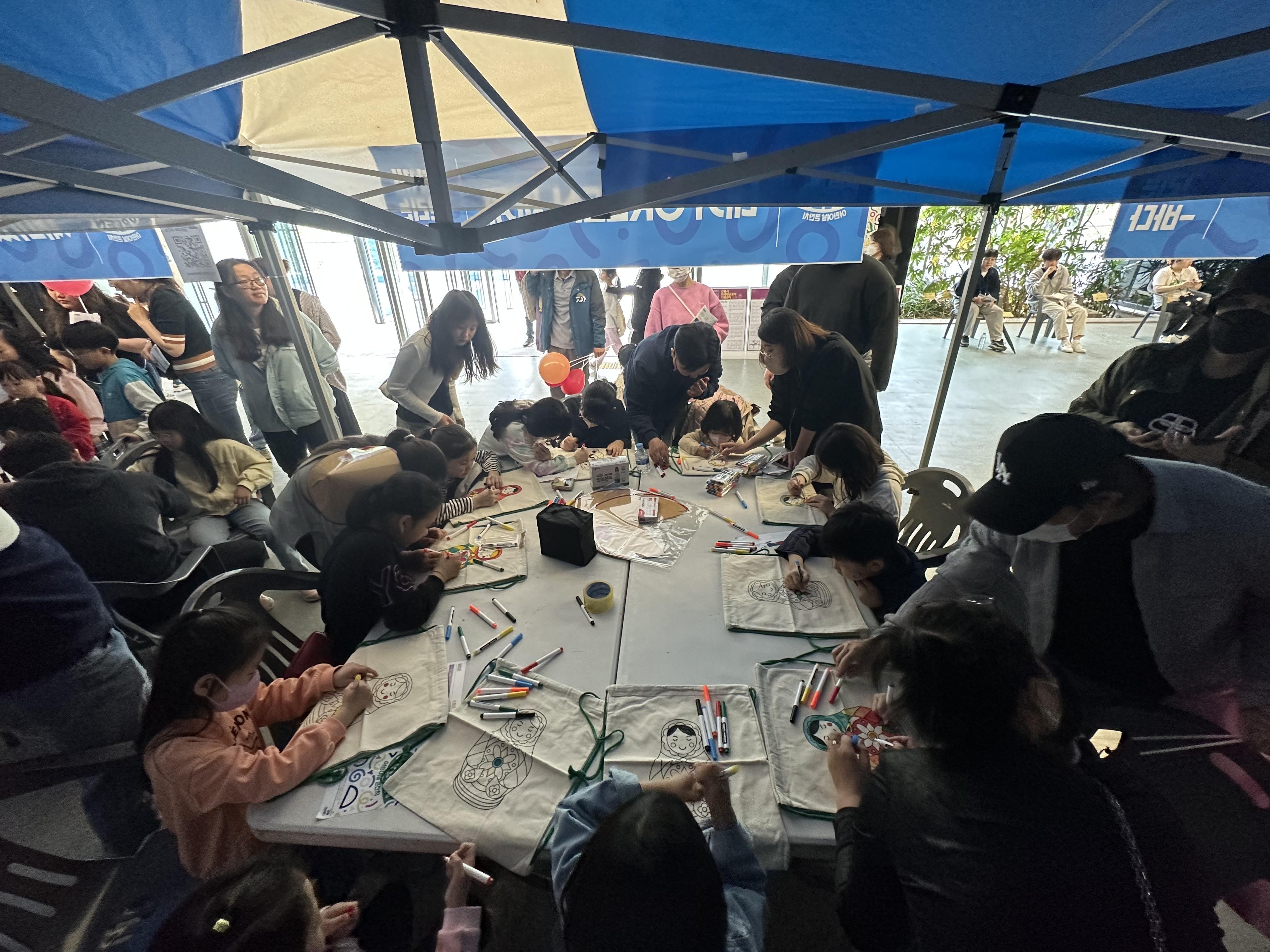 부스를 청소년 자원봉사자가 운영하고, 대학생 사회봉사자가 보조를 하기로 했습니다. 청소년 자원봉사자는 외국인근로자 자녀가 주를 이루었습니다. 우리 손님부터 러시아 마트로시카가 그려진 에코백을 이쁘게 색칠했습니다. 이걸 한개씩 메고 행사장을 돌면서 가득 채워 올 요량이었습니다.