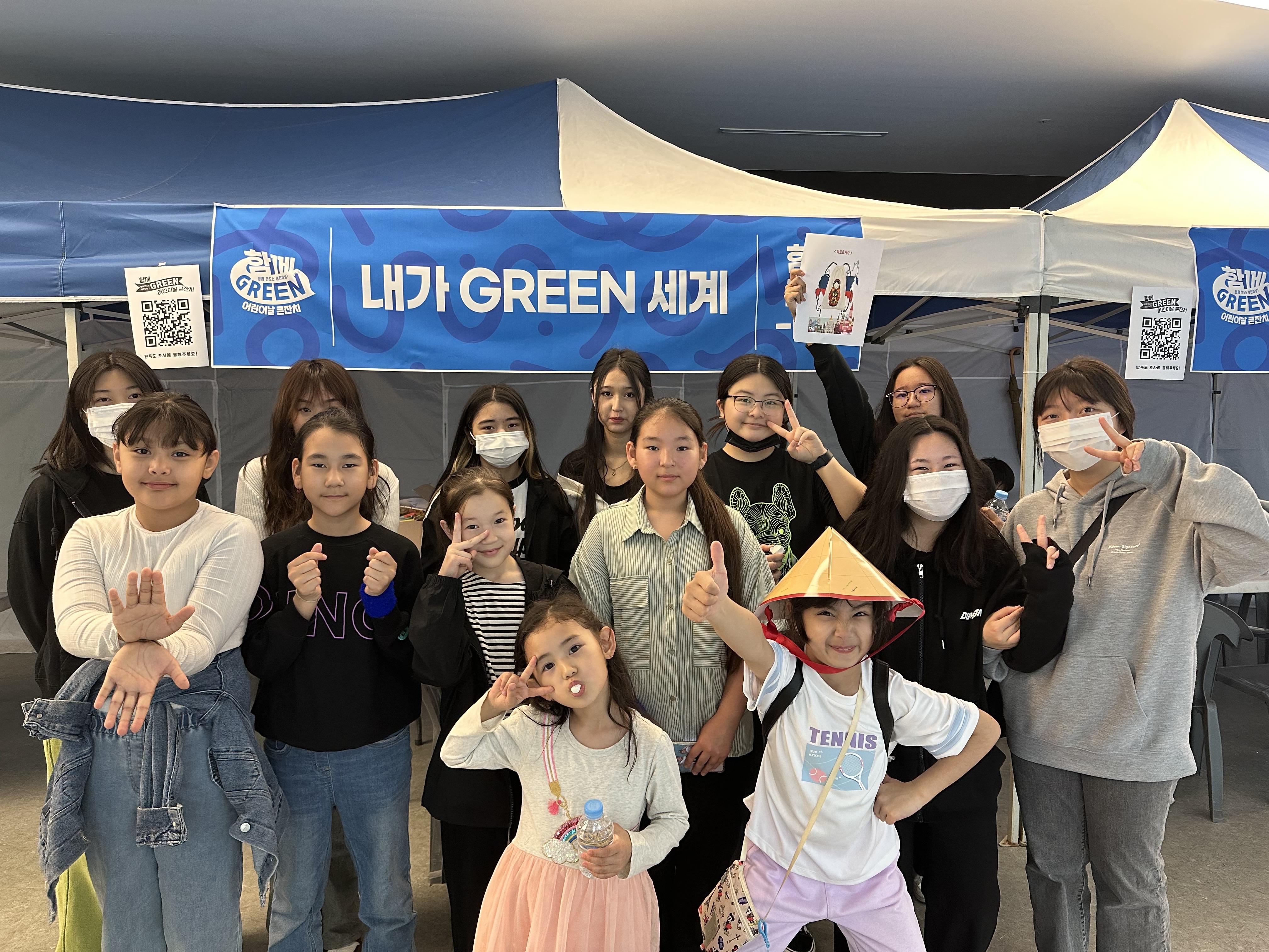 우리 부스(내가 그린 세계)는 러시아 전통나무인형인 마스트로시카가 그려진 에코벡과 베트남 모자인 논라, 캄보디아 코끼리 팔지 체험을 준비했습니다. 부스를 방문한 한국 어린이에게도 좋은 추억이 되었을 것입니다.