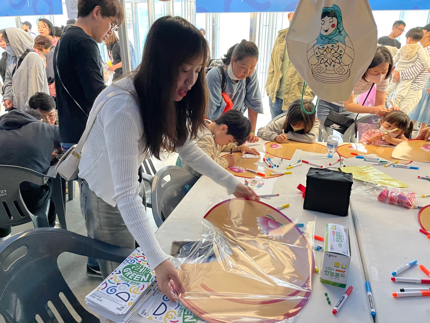 부스를 청소년 자원봉사자가 운영하고, 대학생 사회봉사자가 보조를 하기로 했습니다. 청소년 자원봉사자는 외국인근로자 자녀가 주를 이루었습니다. 우리 손님부터 러시아 마트로시카가 그려진 에코백을 이쁘게 색칠했습니다. 이걸 한개씩 메고 행사장을 돌면서 가득 채워 올 요량이었습니다.