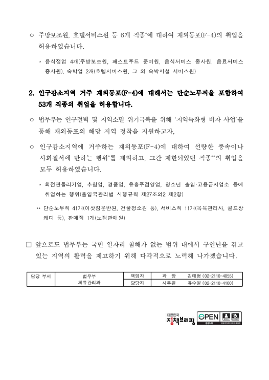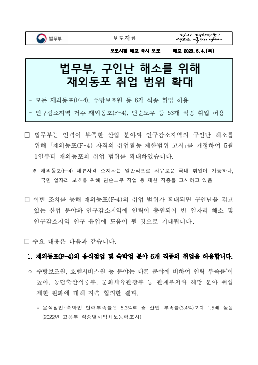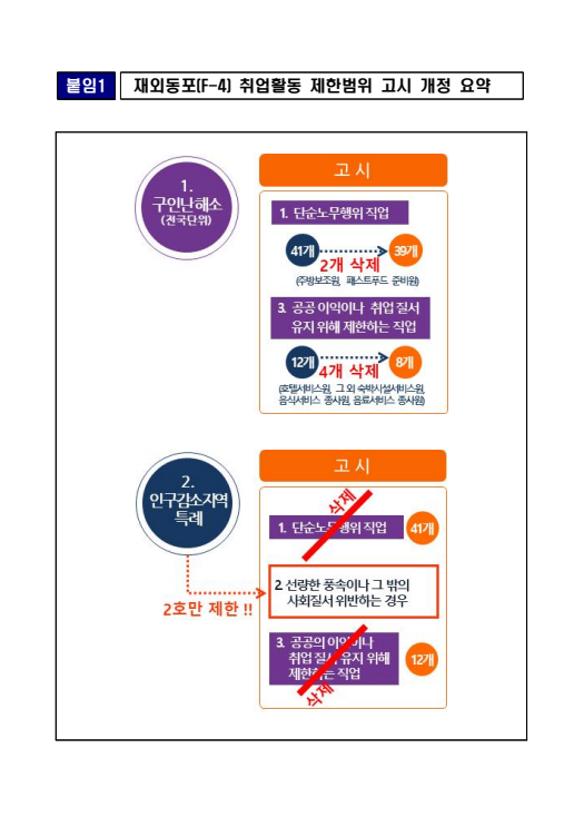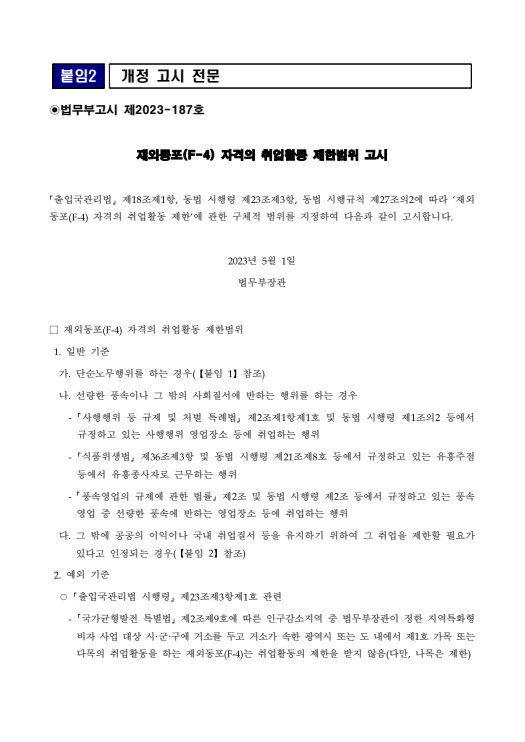 | [하이코리아] 재외동포(F-4) 자격의 취업활동 제한범위 고시 (0) | 2023.05.03 |
