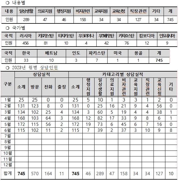 | 2023년 외국인근로자 상담 운영현황표(23.04.06 기준) (0) | 2023.04.06 |