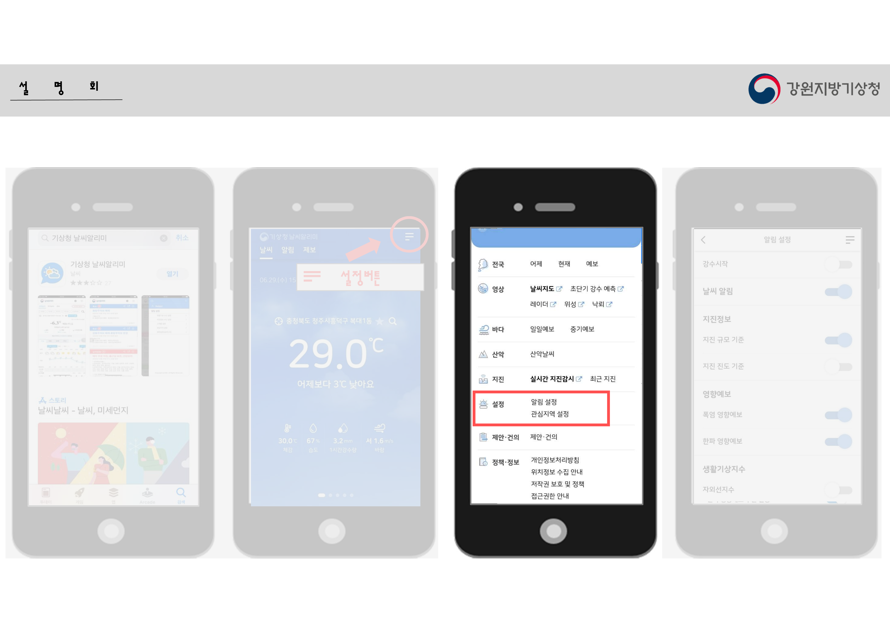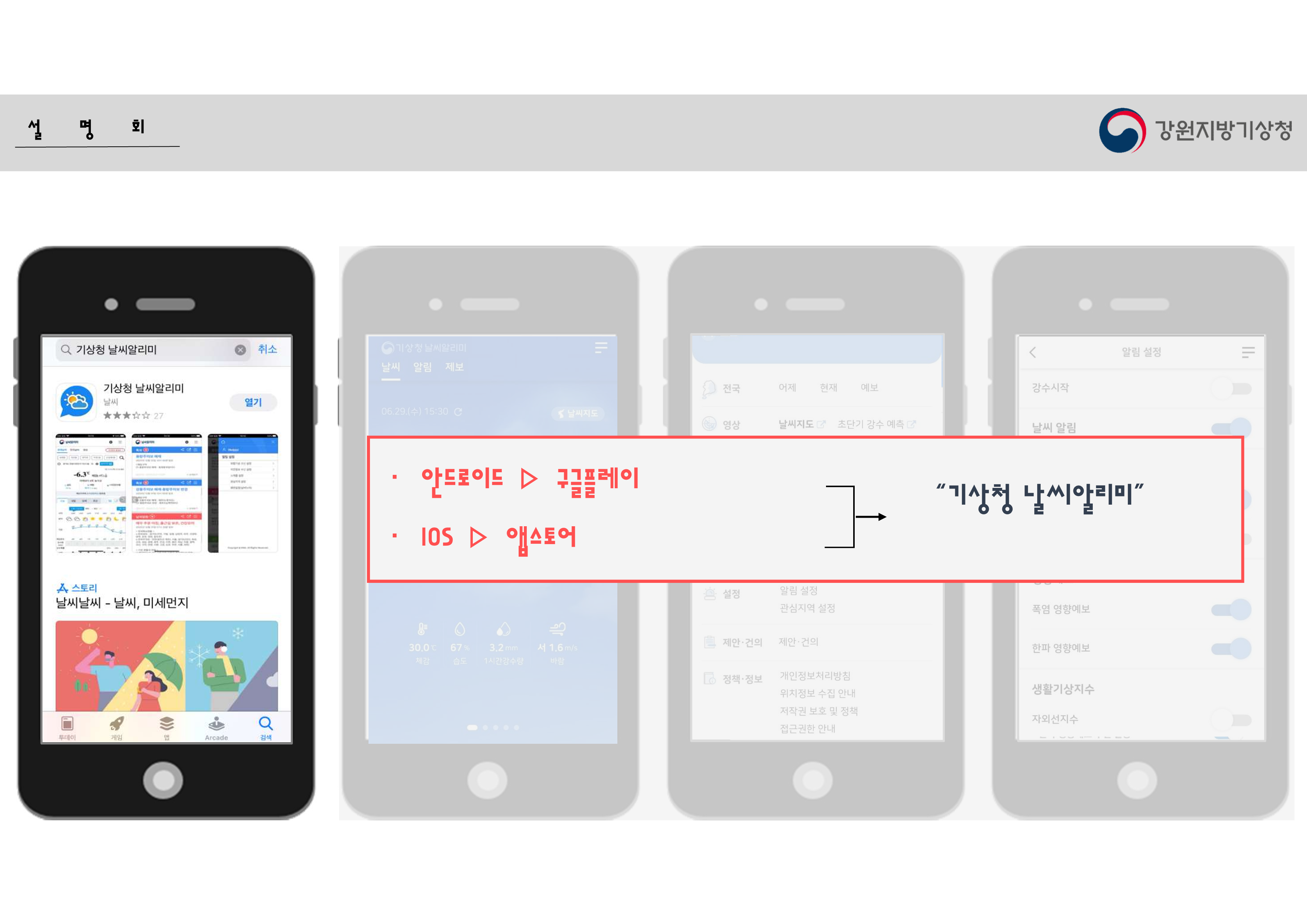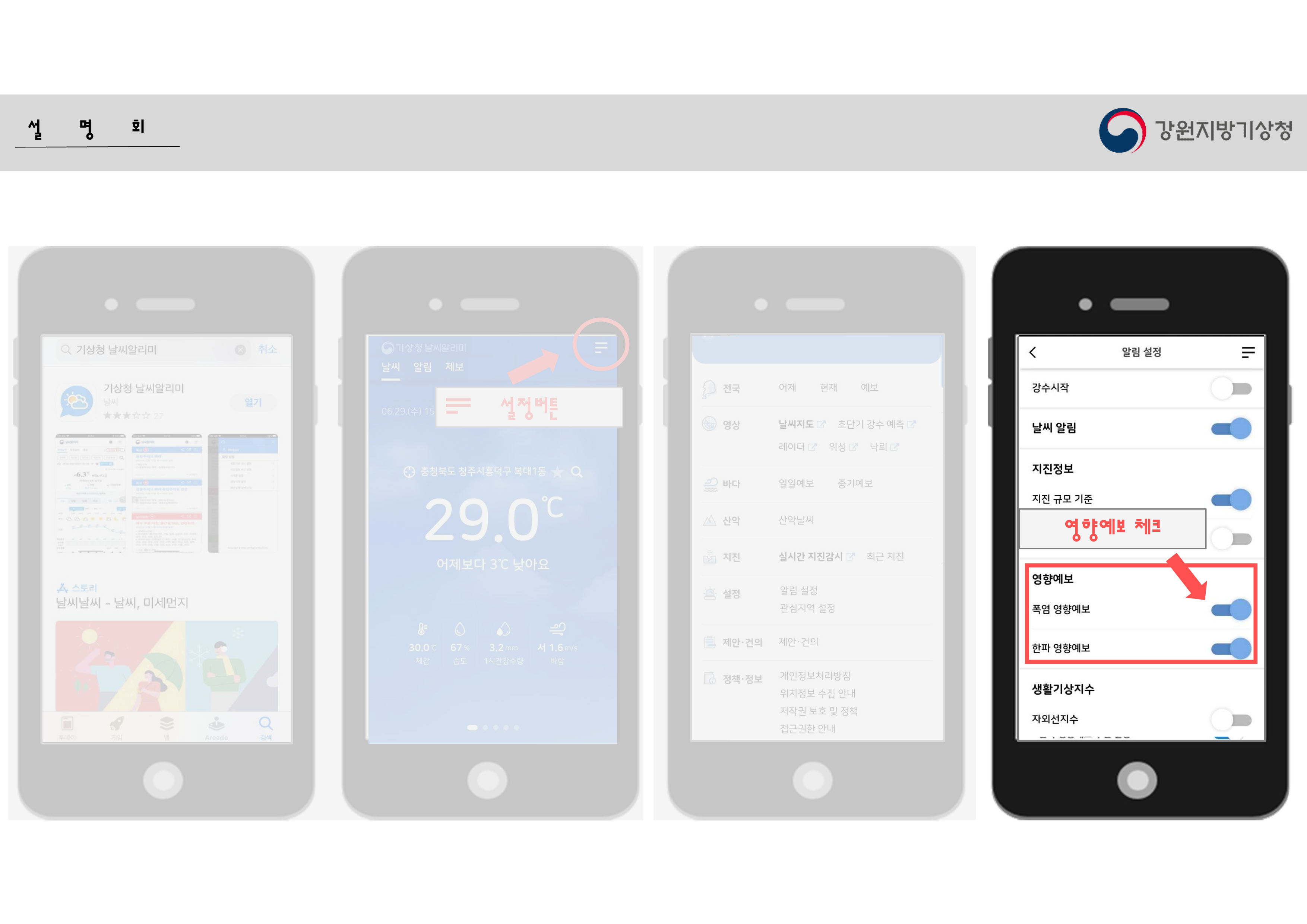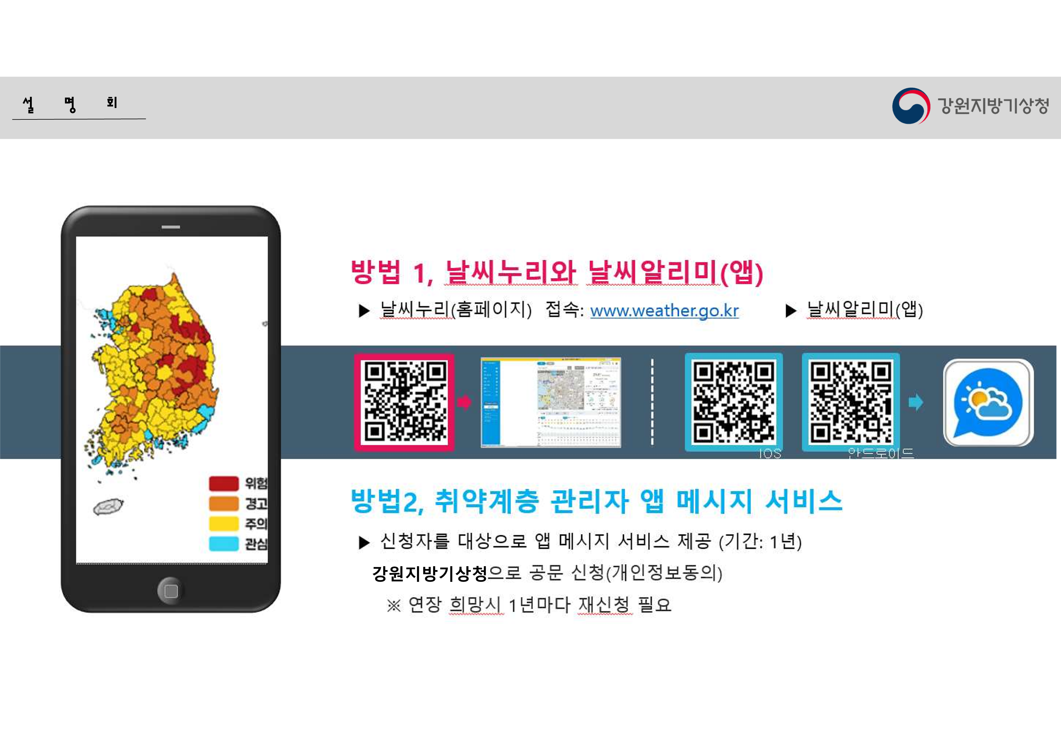 준비해 온 자료를 박유정 주무관이 쉽게 안내해 주었고, 핸드폰에 날씨알리미 앱을 설치해 보았습니다.