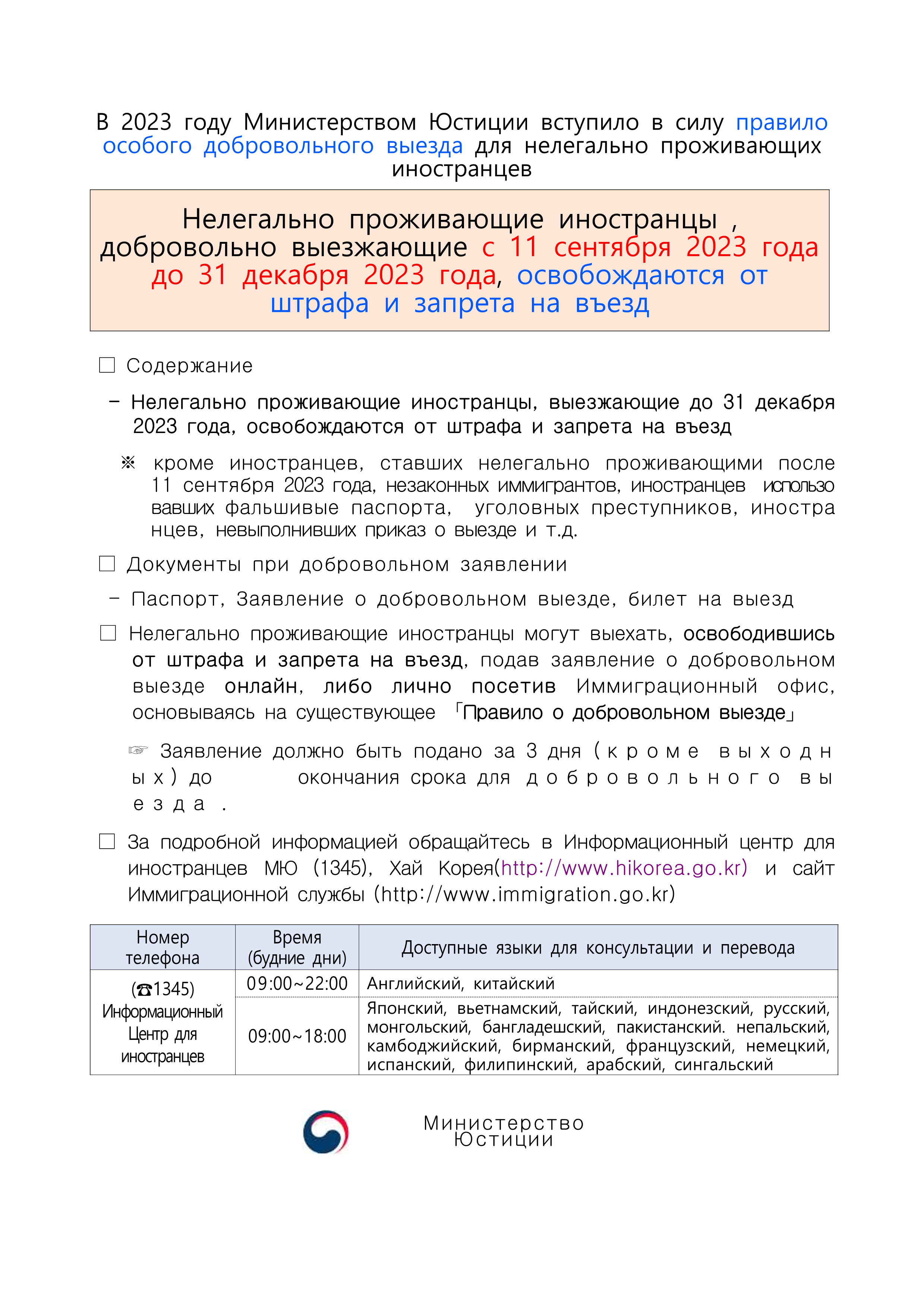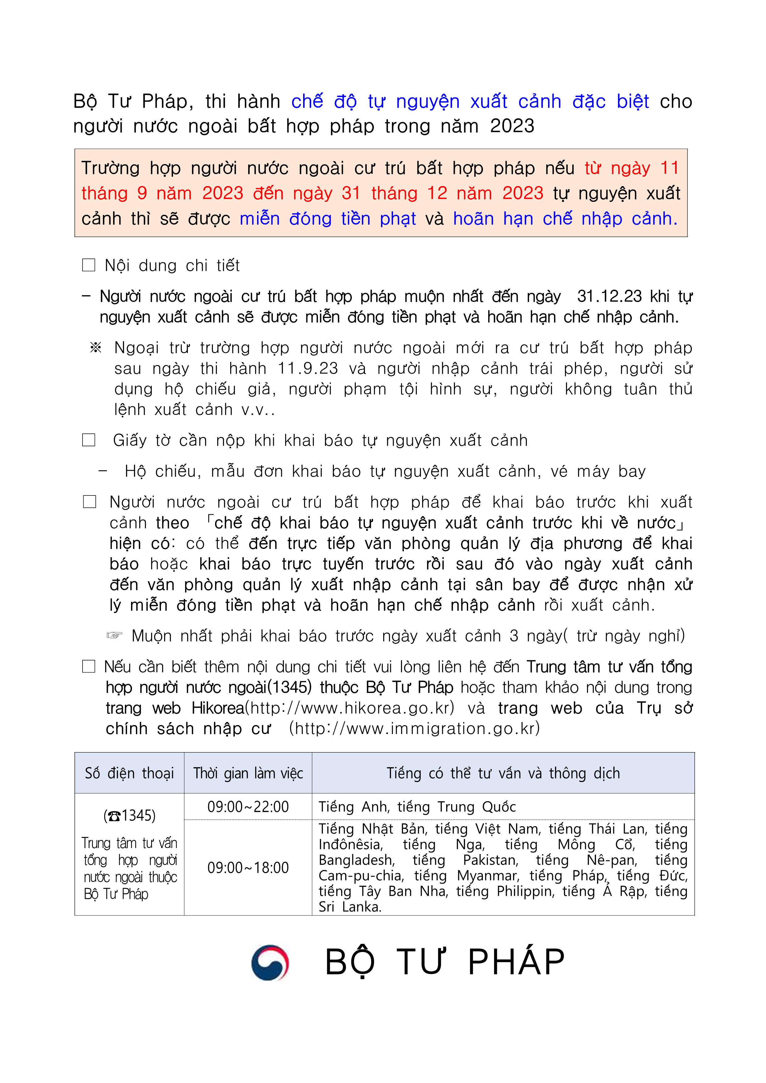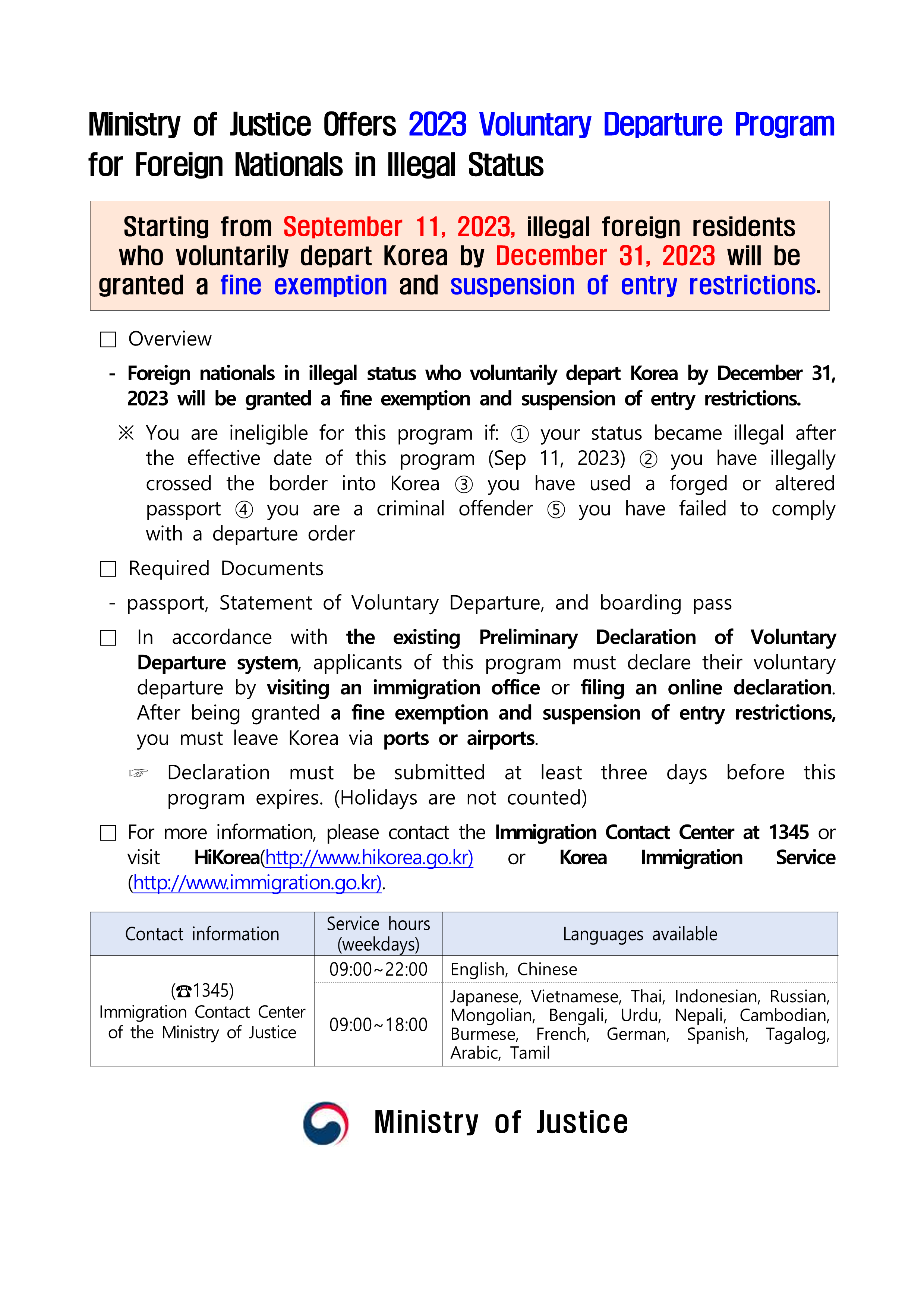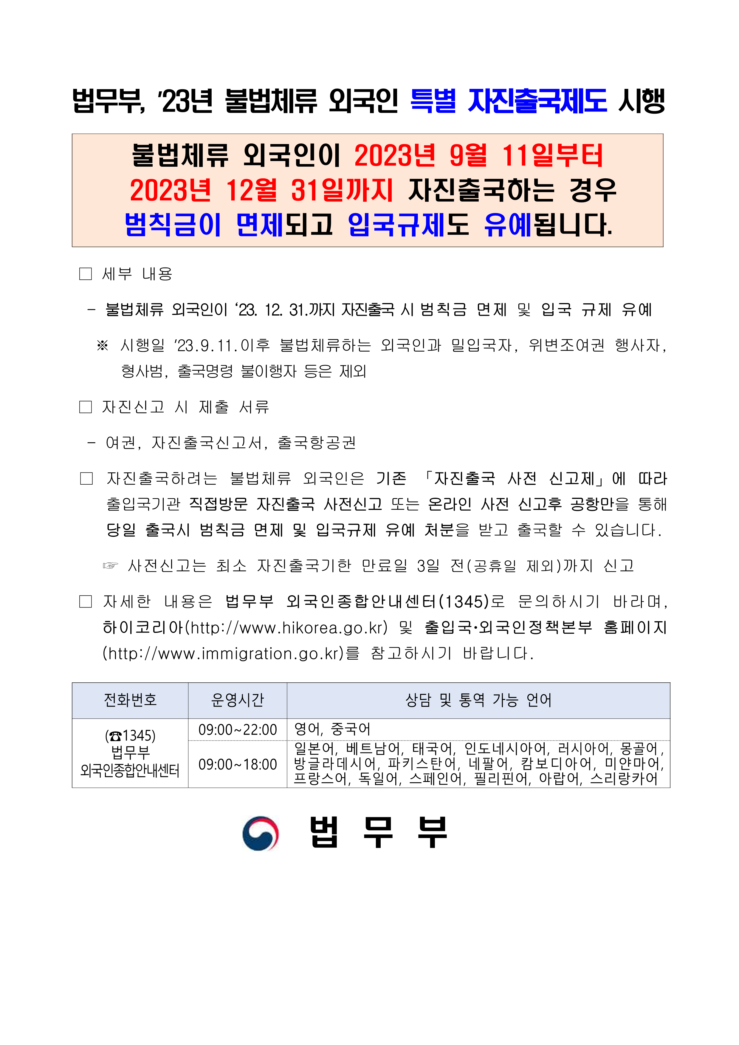 - 대상 : 해당기간에 자진출국하는 불법체류 외국인(23.9.11. 이후 불법체류하는 외국인은 대상에서 제외