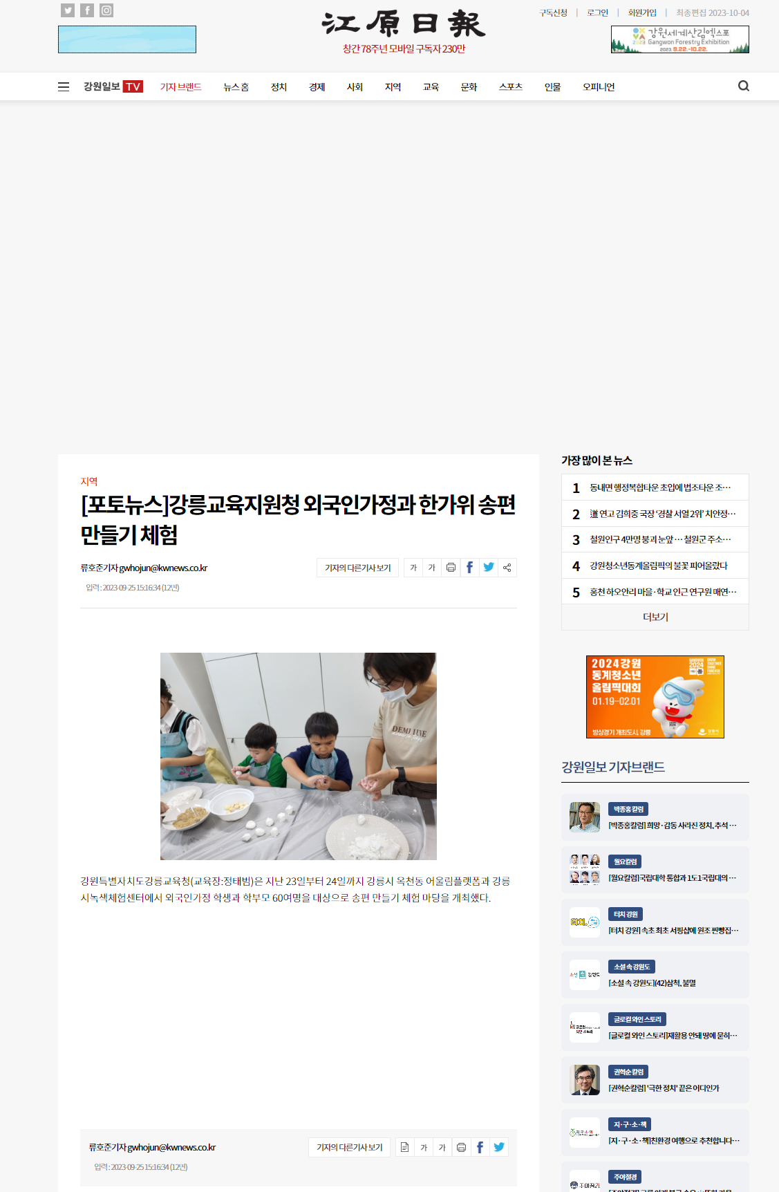 [보도자료_강원일보] 강릉교육지원청 외국인가정과 한가위 송편만들기 체험