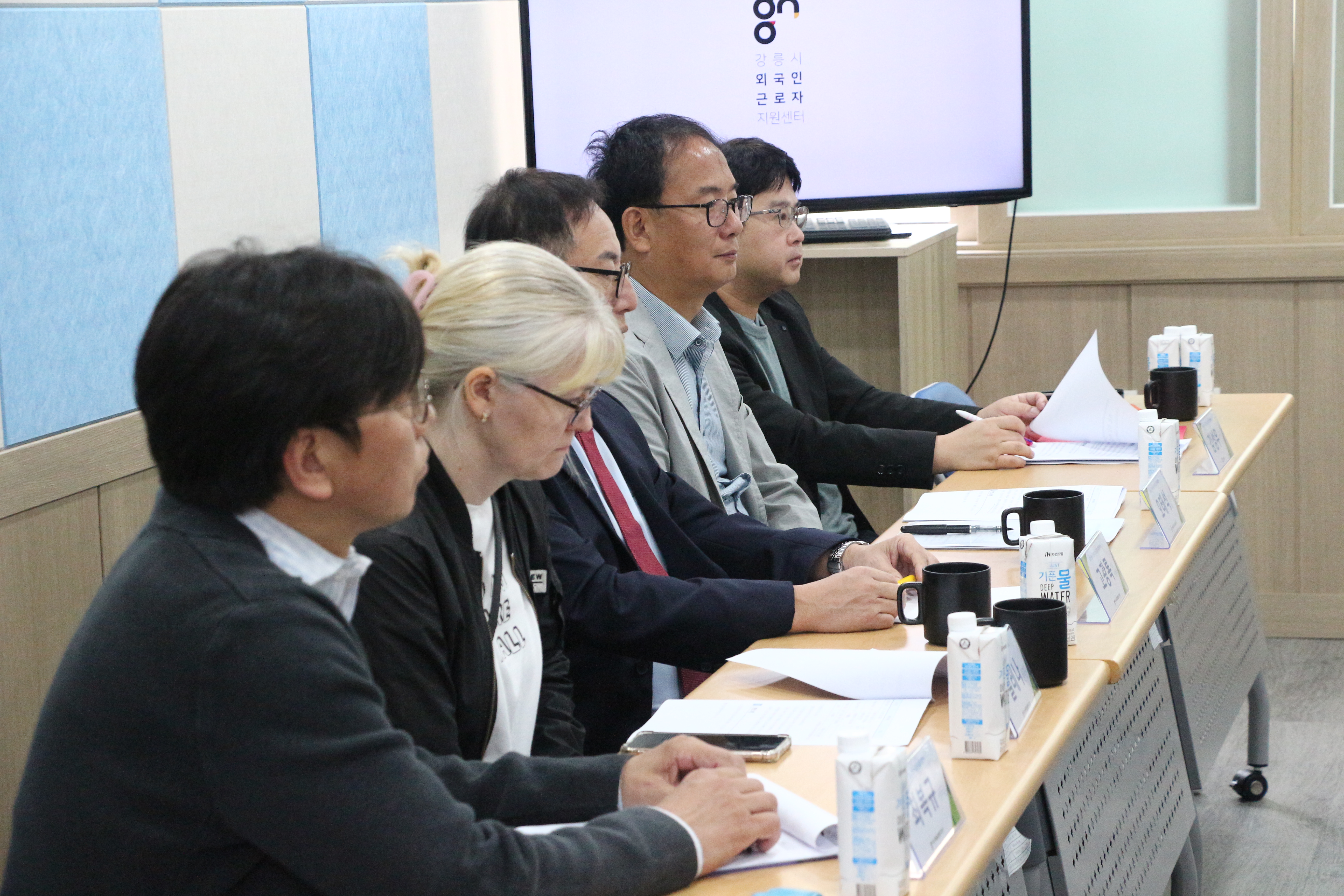 센터에서는 최길영 이사장과 고광록 운영위원장, 사무국장, 통역원이 참여했습니다. 강릉시에서는 담당계장이 참여하였습니다.