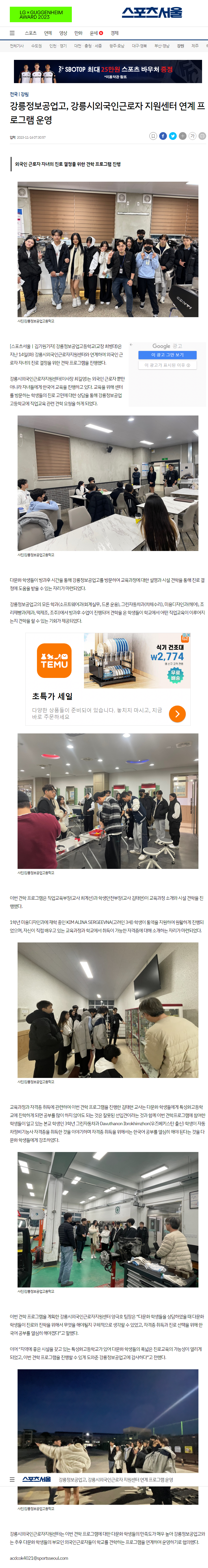 [언론보도] 강릉정보공업고, 강릉시외국인근로자지원센터 연계프로그램 운영