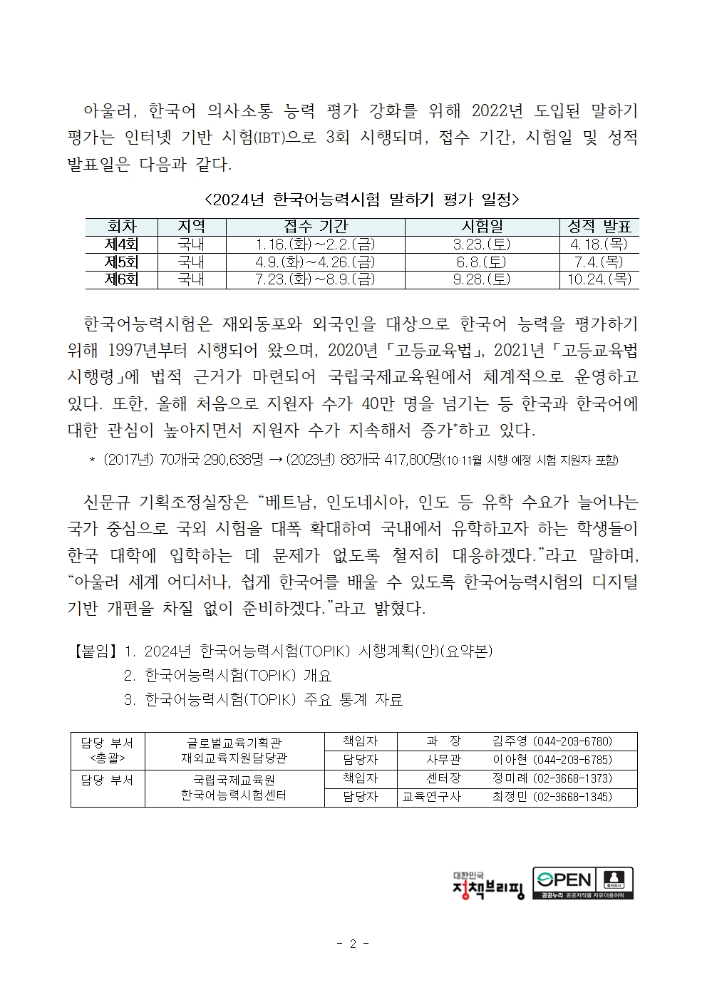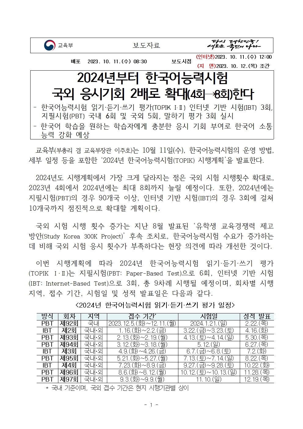 [교육부] 2024년 한국어능력시험(TOPIK) 국외 응시기회 2배로 확대