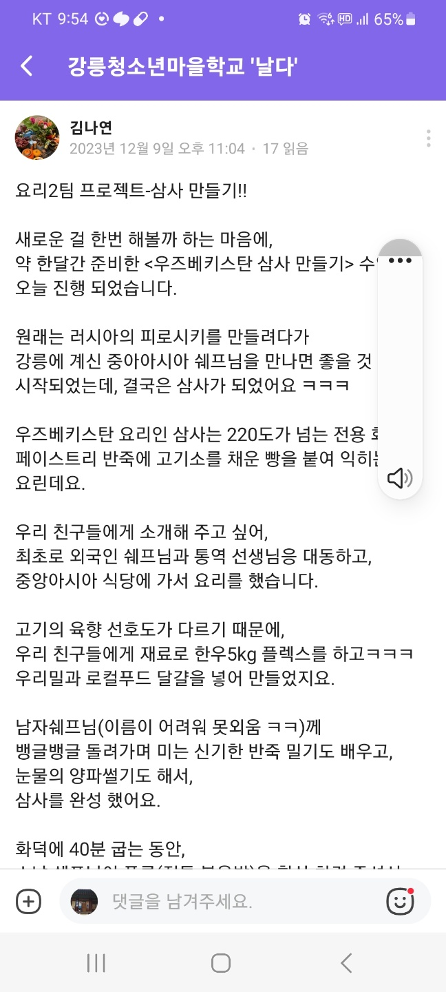 '강릉청소년마을학교 날다'에서 요리2팀 프로젝트로 삼사만들기를 하러 왔습니다.