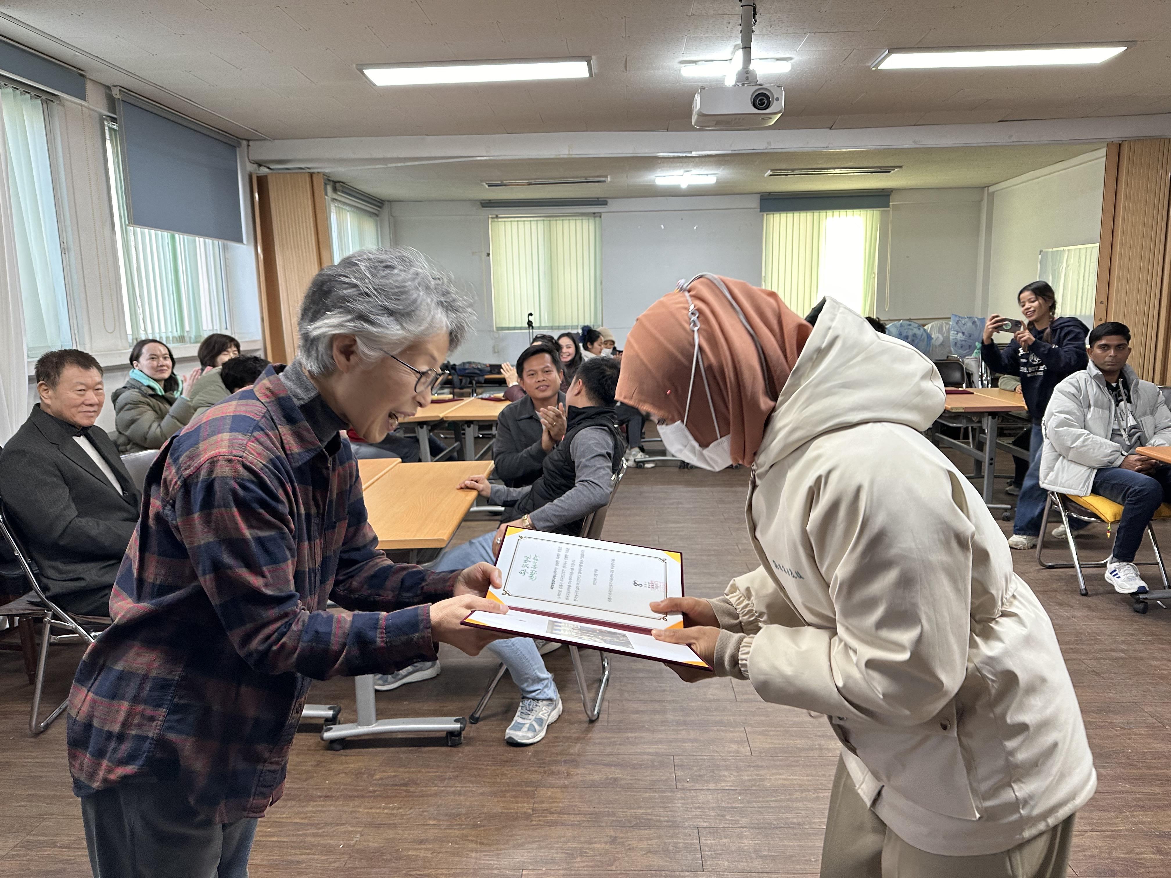 꾸준히, 성실하게, 재미있게 이로운 한국어교실에 참여해 준 9명의 외국인근로자에게 수료증을 주었습니다.