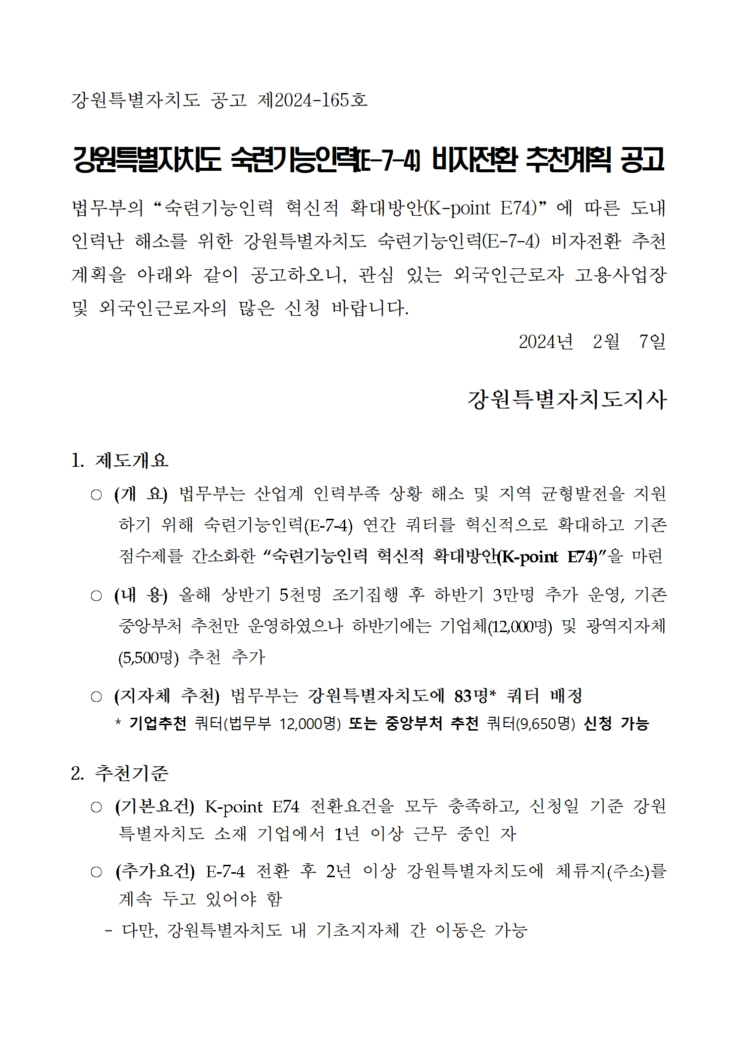 2024년 강원특별자치도 숙련기능인력(E-7-4) 비자전환 추천계획 공고문.hwp