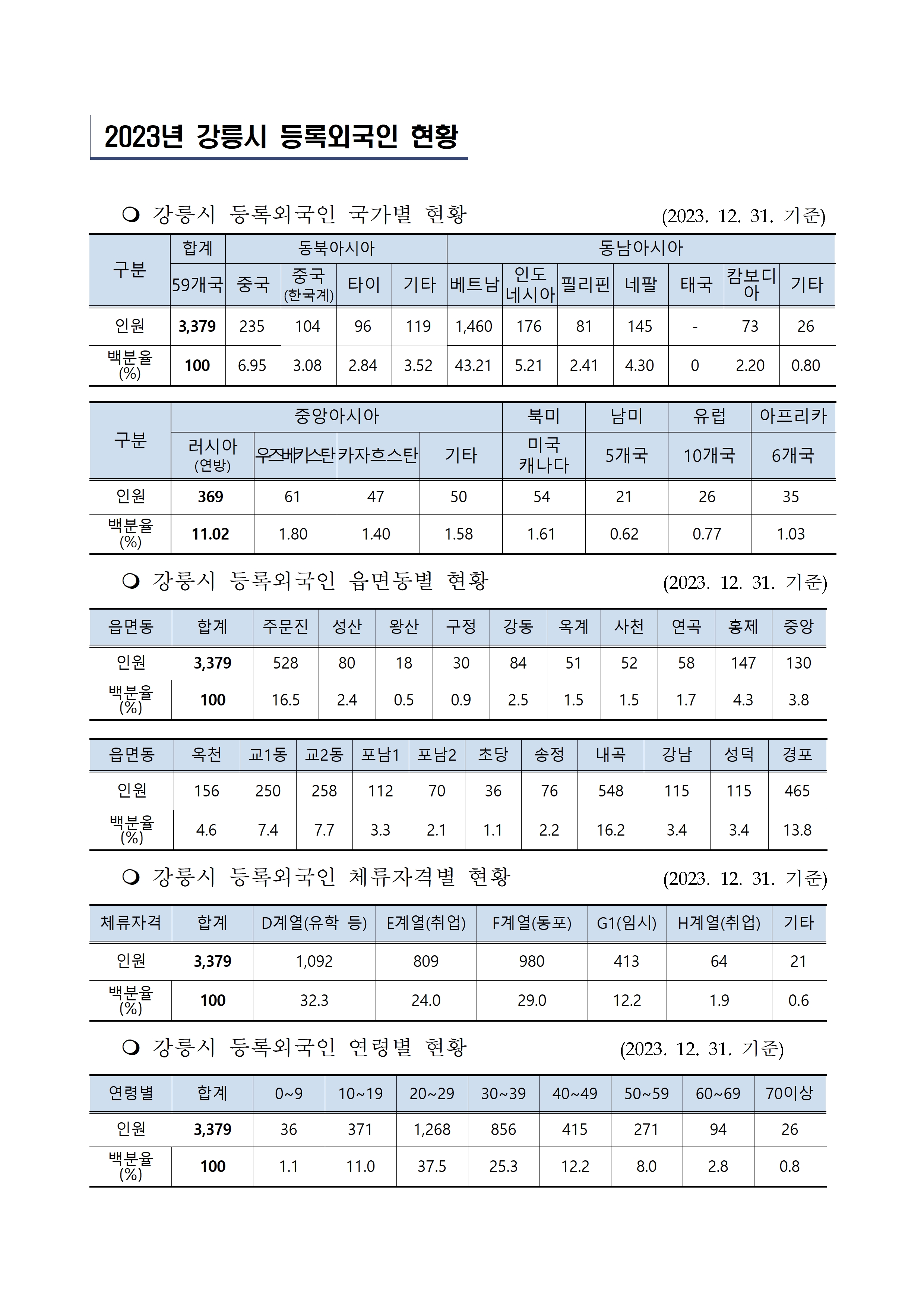 2023년 12월 기준 강릉시 등록외국인현황입니다.