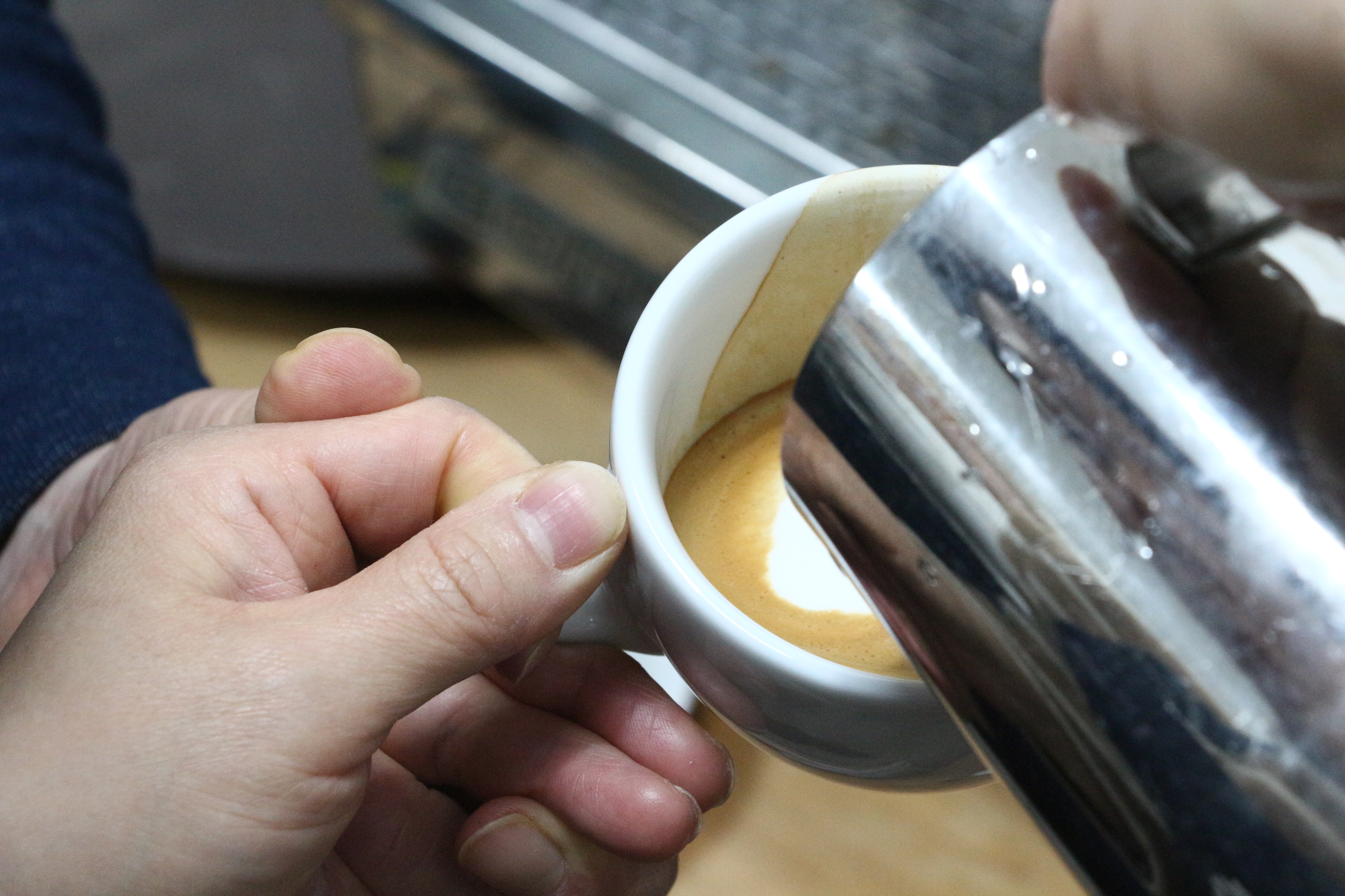 강의에서는 라떼의 비율과 추출방법, 컵크기에 따른 비율 변경 요령을 배우고 실습을 시작했습니다.