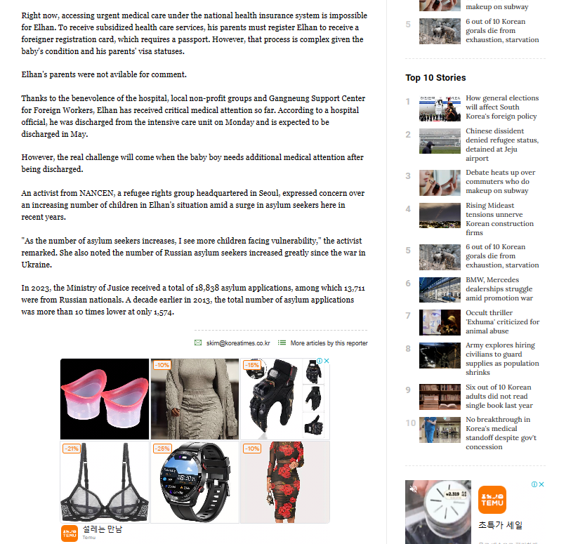 | [강원도민일보] '1억원 훌쩍' 미등록 외국인 가정 신생아 병원비에 생사기로 (0) | 2024.04.15 |