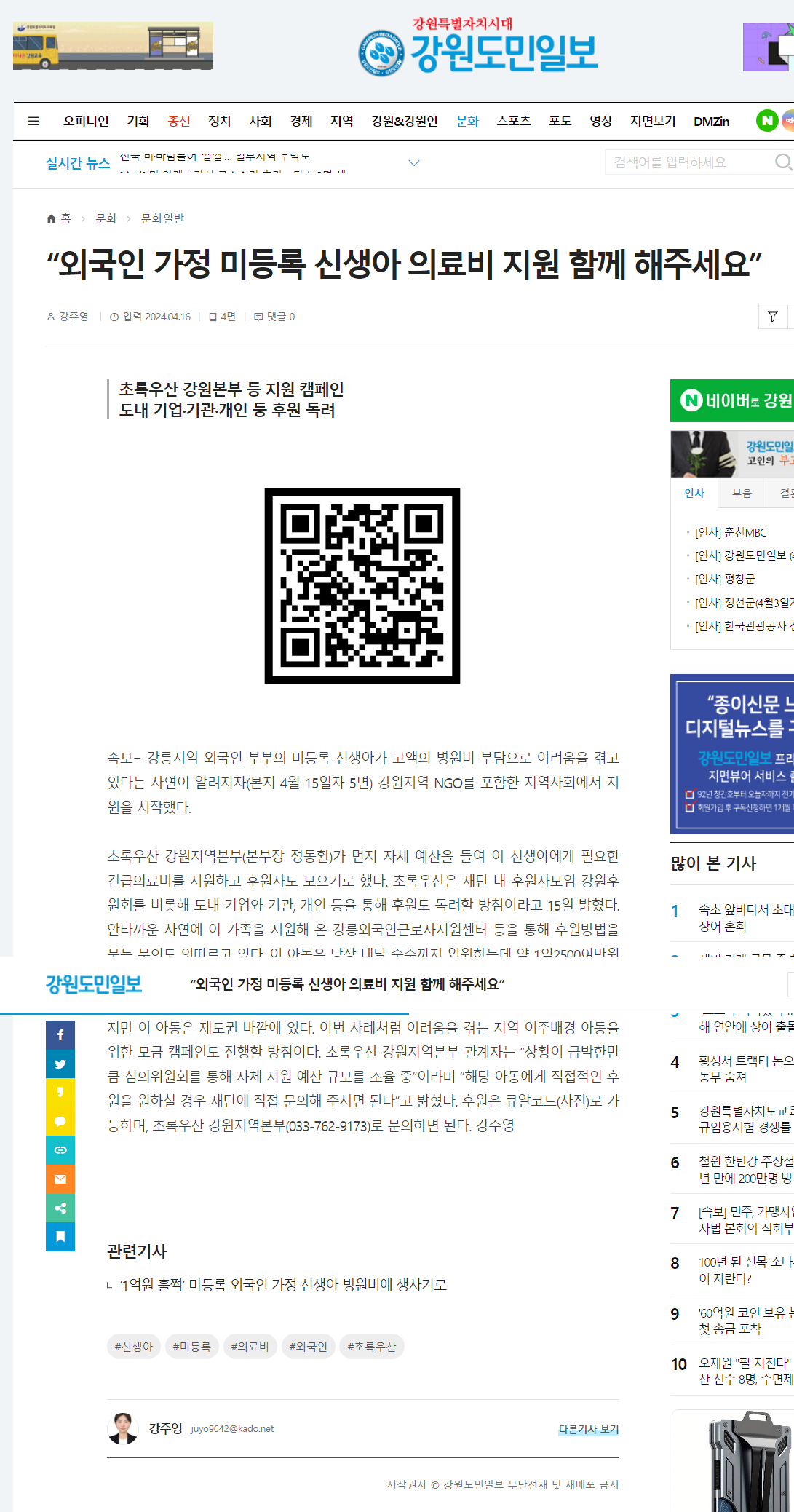 “외국인 가정 미등록 신생아 의료비 지원 함께 해주세요” < 문화일반 < 문화 < 기사본문 - 강원도민일보 (kado.net)