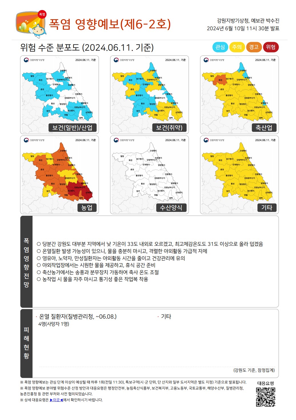 강원지방기상청에서 전하는 2024년 6월 11일 기준 폭염영향예보입니다.