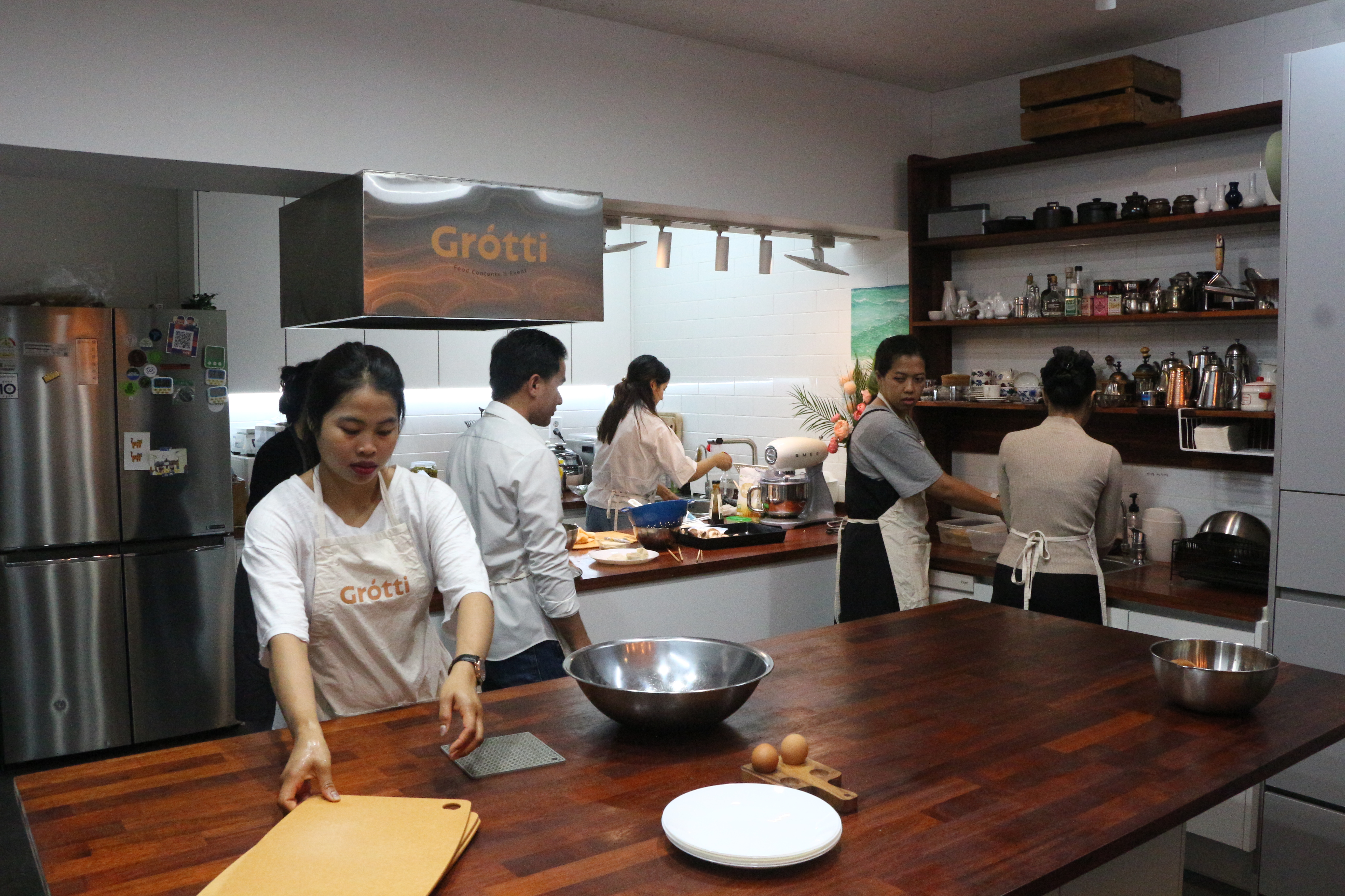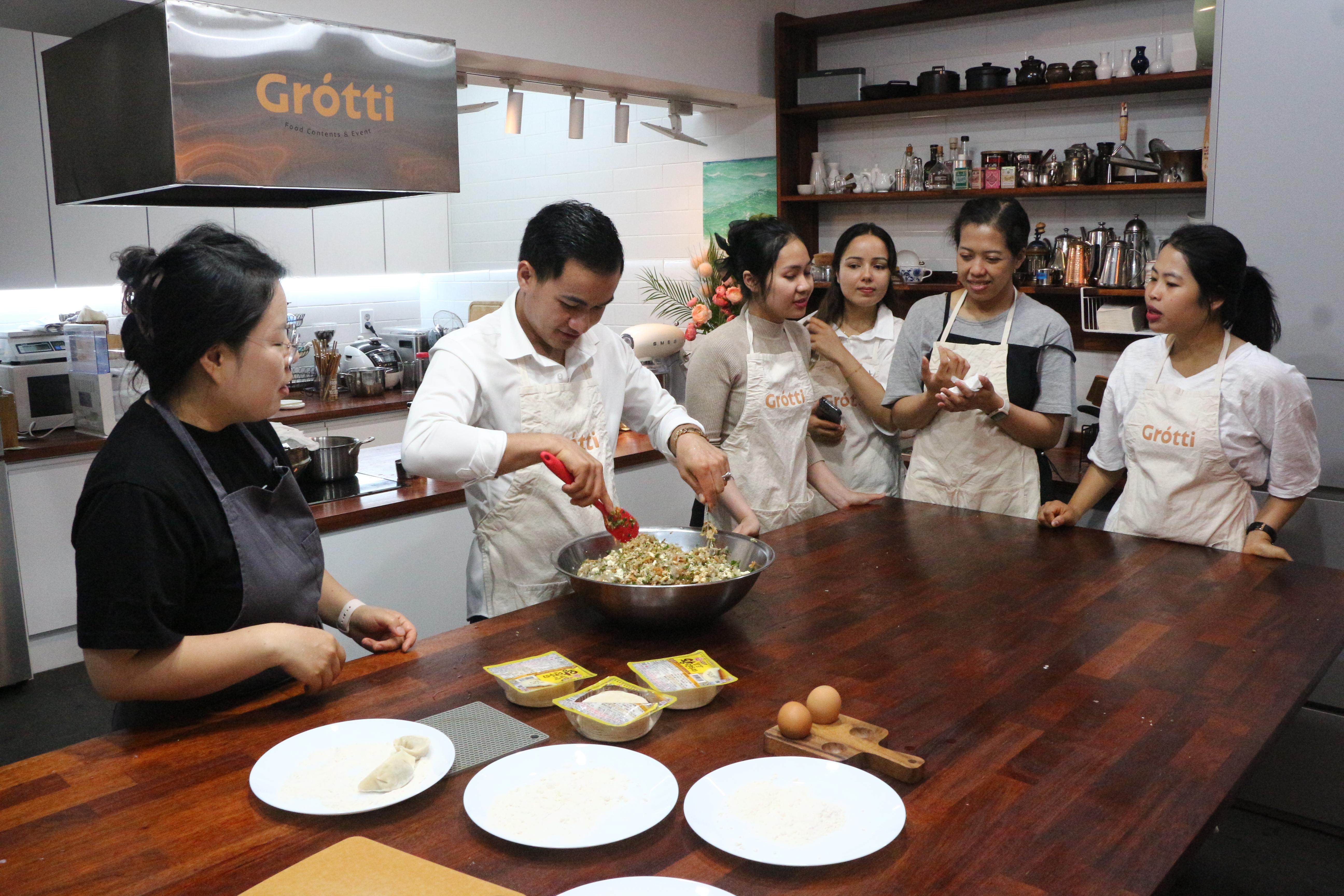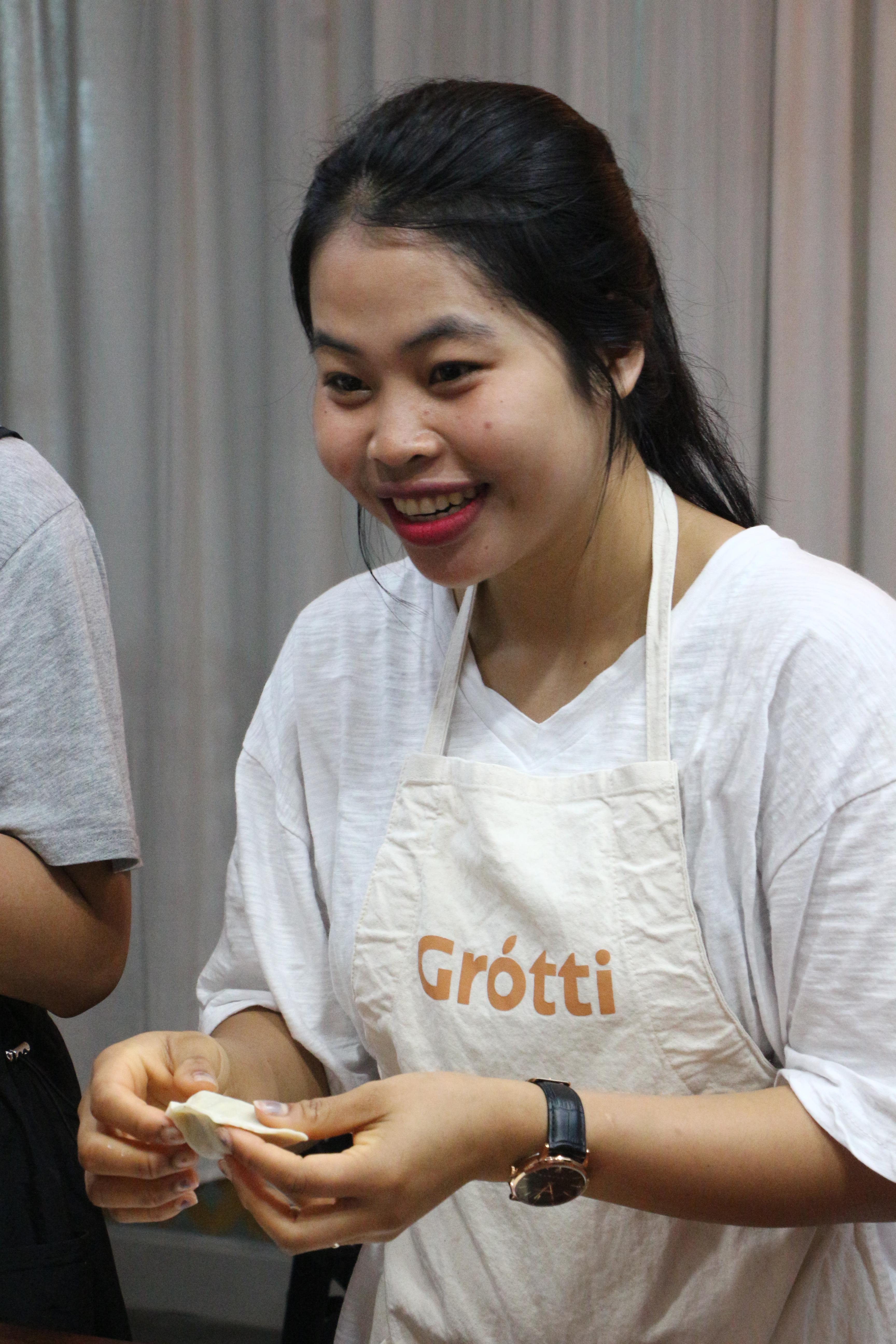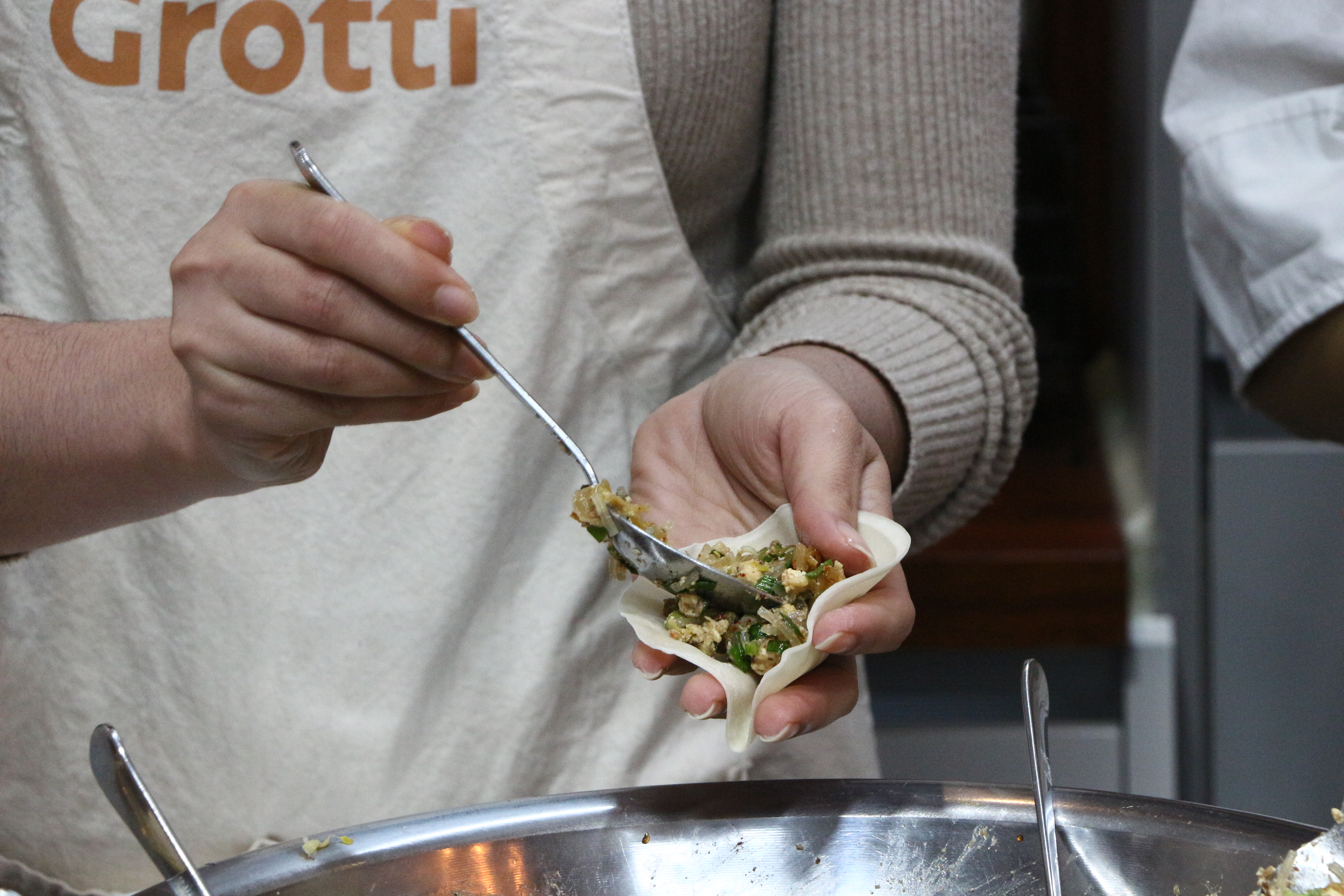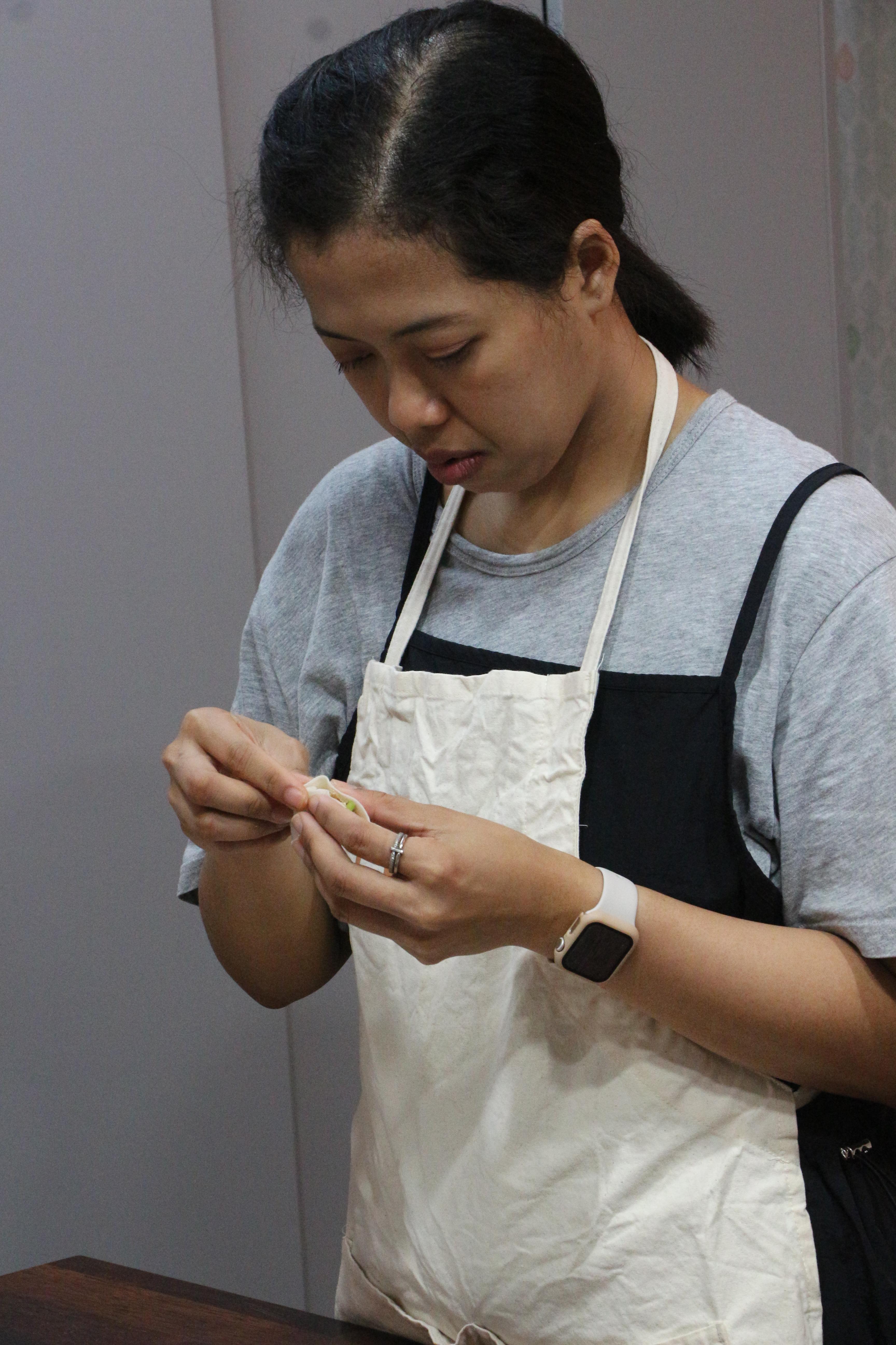 그로티 김나연 대표가 먼저 식재료에 대한 간단한 설명과 맛있게 다루는 방법을 설명해 주었습니다. 재료손질 방법도 꼼꼼히 설명하다 보니, 벌써 채식만두 소가 다 준비되었습니다. 이제 만두를 빚을 순서입니다. 준비된 소를 만두피에 적당량 넣고 물을 발라 끝을 아무립니다.