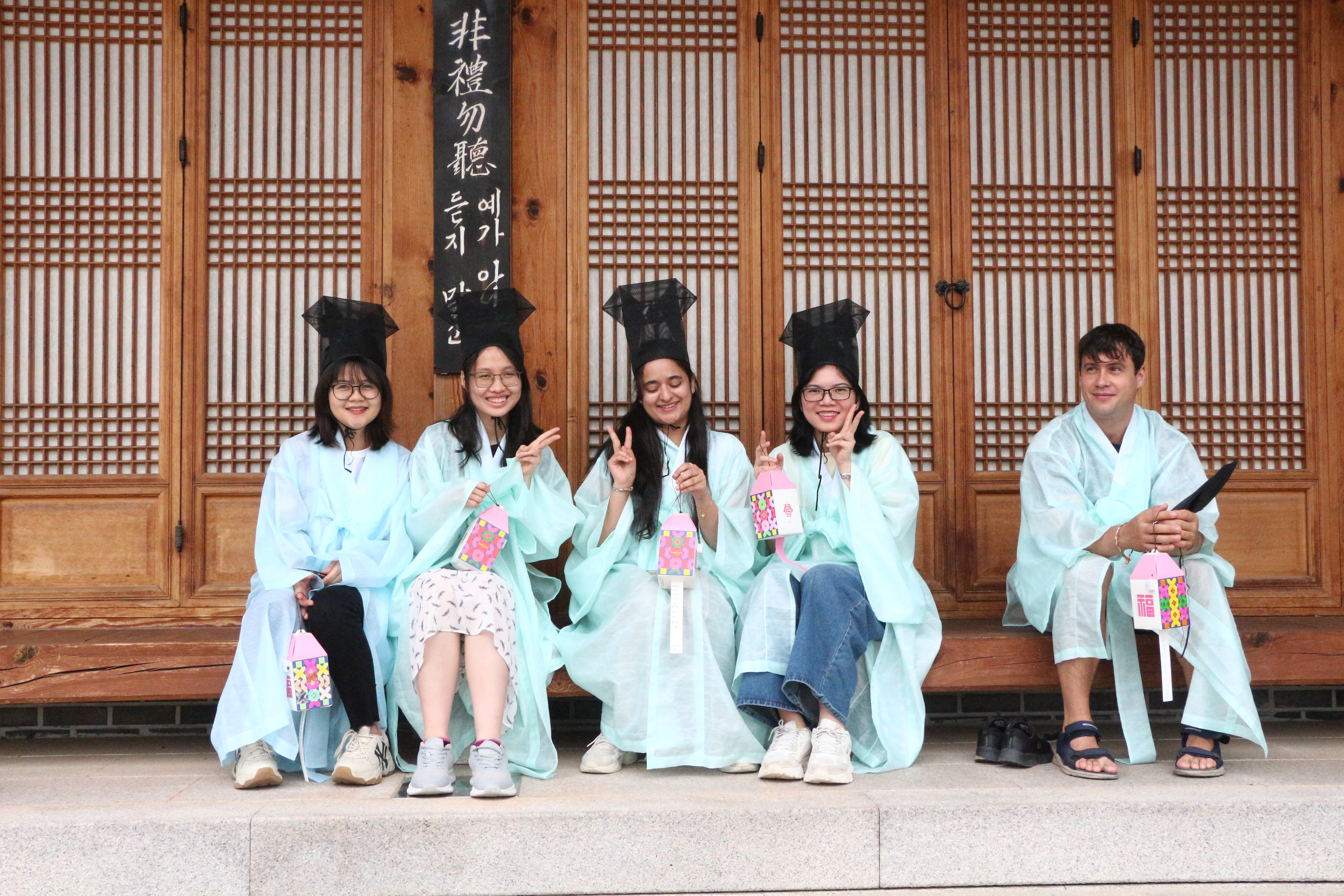 도포에 고름이 있잖아요. 이게 또 어렵습니다. 이것도 맬 줄 아는 희망연대본부 참여자가 도와 주어 단정하게 입을 수 있었습니다. 한옥을 배경으로 단체 사진을 찍고, 각자 추억을 담는 시간을 가졌습니다.