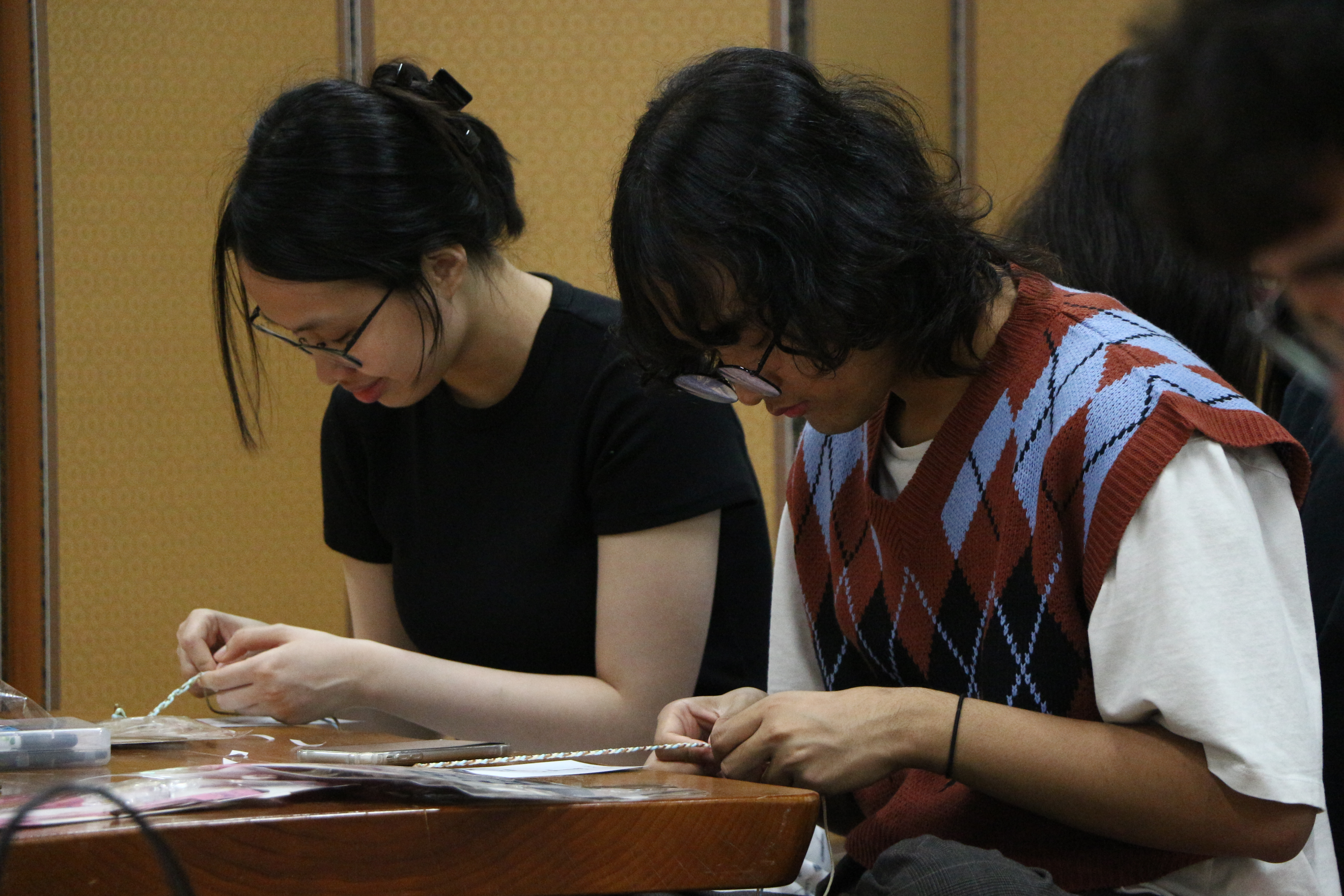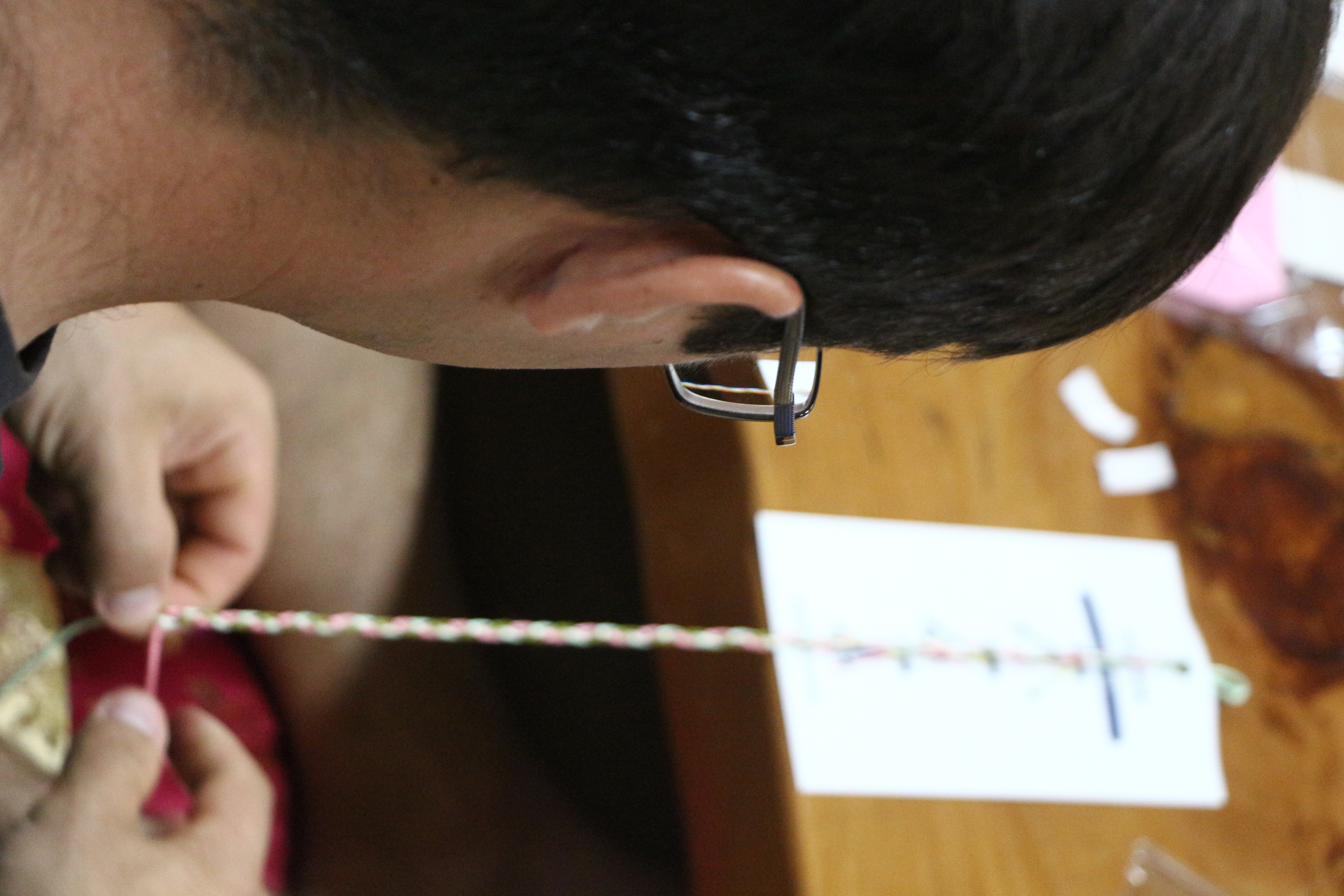세가닥 실을 순서에 맞게 계속 꼬아 한개의 굵은 줄로 만들어 팔찌를 만들었습니다. 특히 자기 팔목에 맞게 줄 길이를 조절할때는 혼자 할 수 없어서 자연스레 옆에 있는 동지(?)들과 서로 도와 주게 되었습니다. 다 만들어진 장명고를 하나로 모아 기념사진도 찍고....